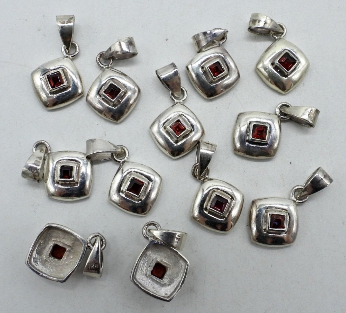 12 IDENTICAL STERLING PENDANTS WITH SMALL GARNETS. 1″ LONG. (15.5 DWT)