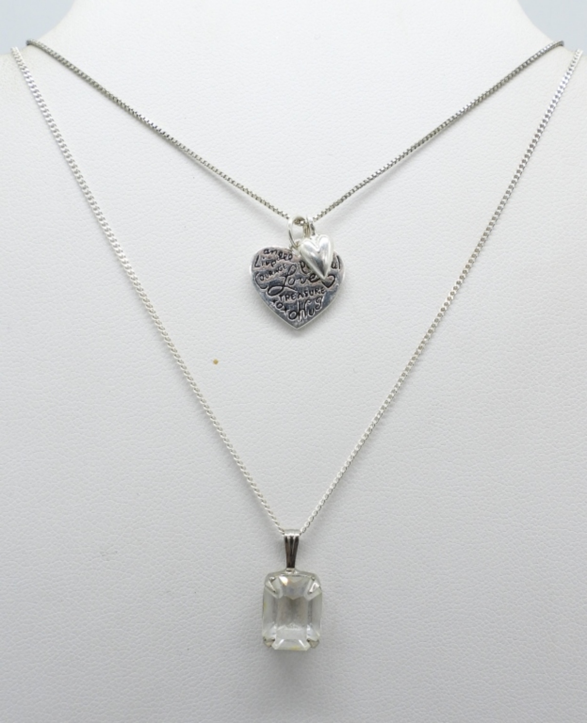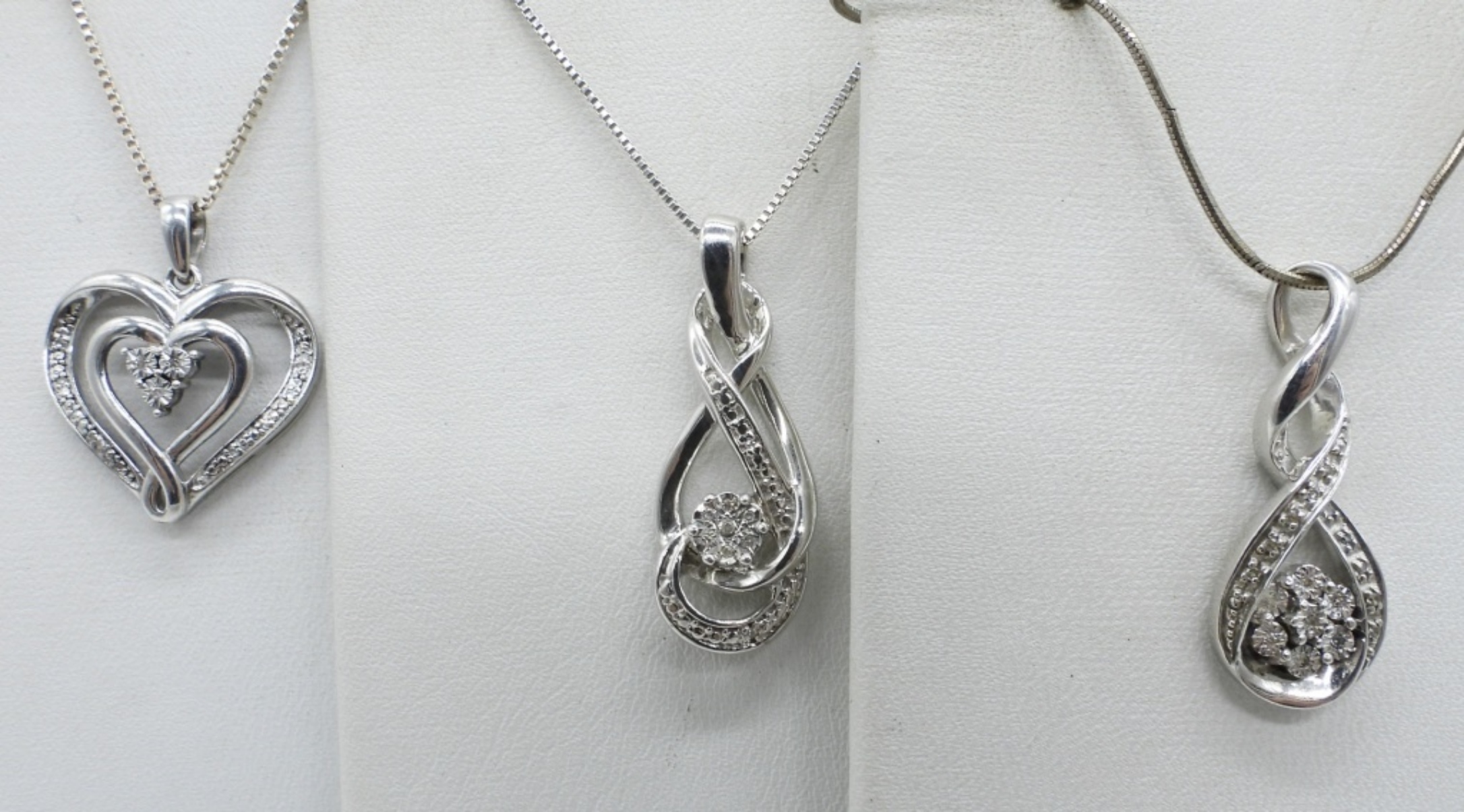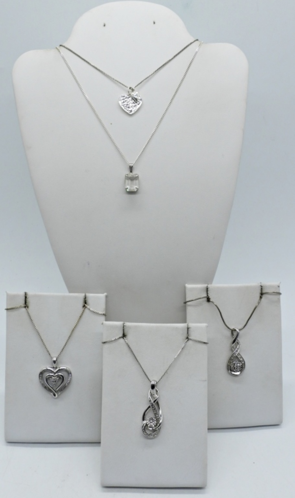 SOME TINY GENUINE DIAMONDS AND SOME SIMULATED DIAMONDS. FIVE STERLING NECKLACES, ALL 18″ LONG. (13.5 DWT)