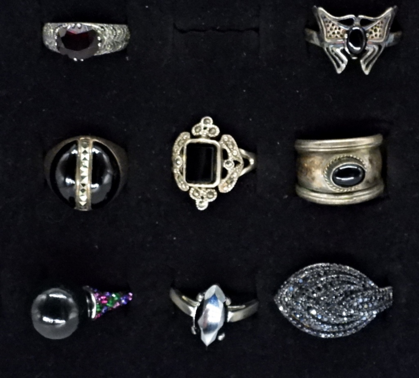 EIGHT STERLING RINGS. WITH MARCASITE, BLACK ONYX & OTHER DARK GEMSTONES. SIZES 6-9 (25 DWT)