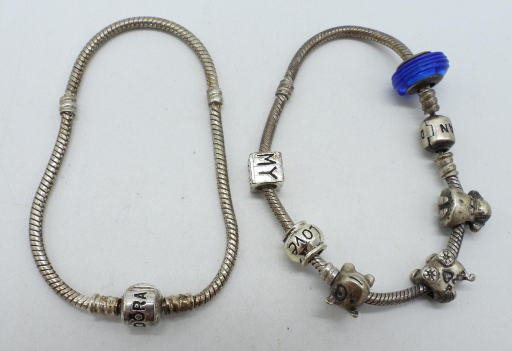 TWO STERLING PANDORA CHARM BRACELETS, 6 STERLING CHARMS. (29.8 DWT)