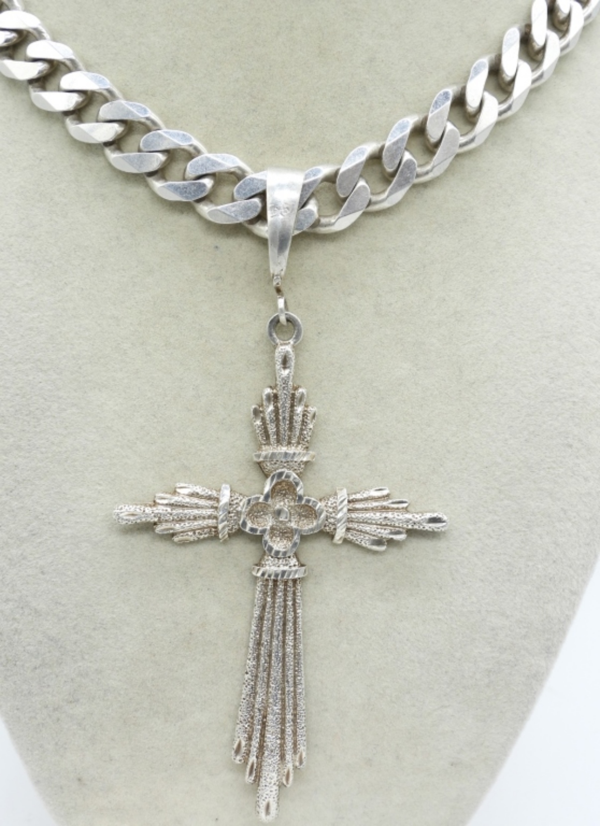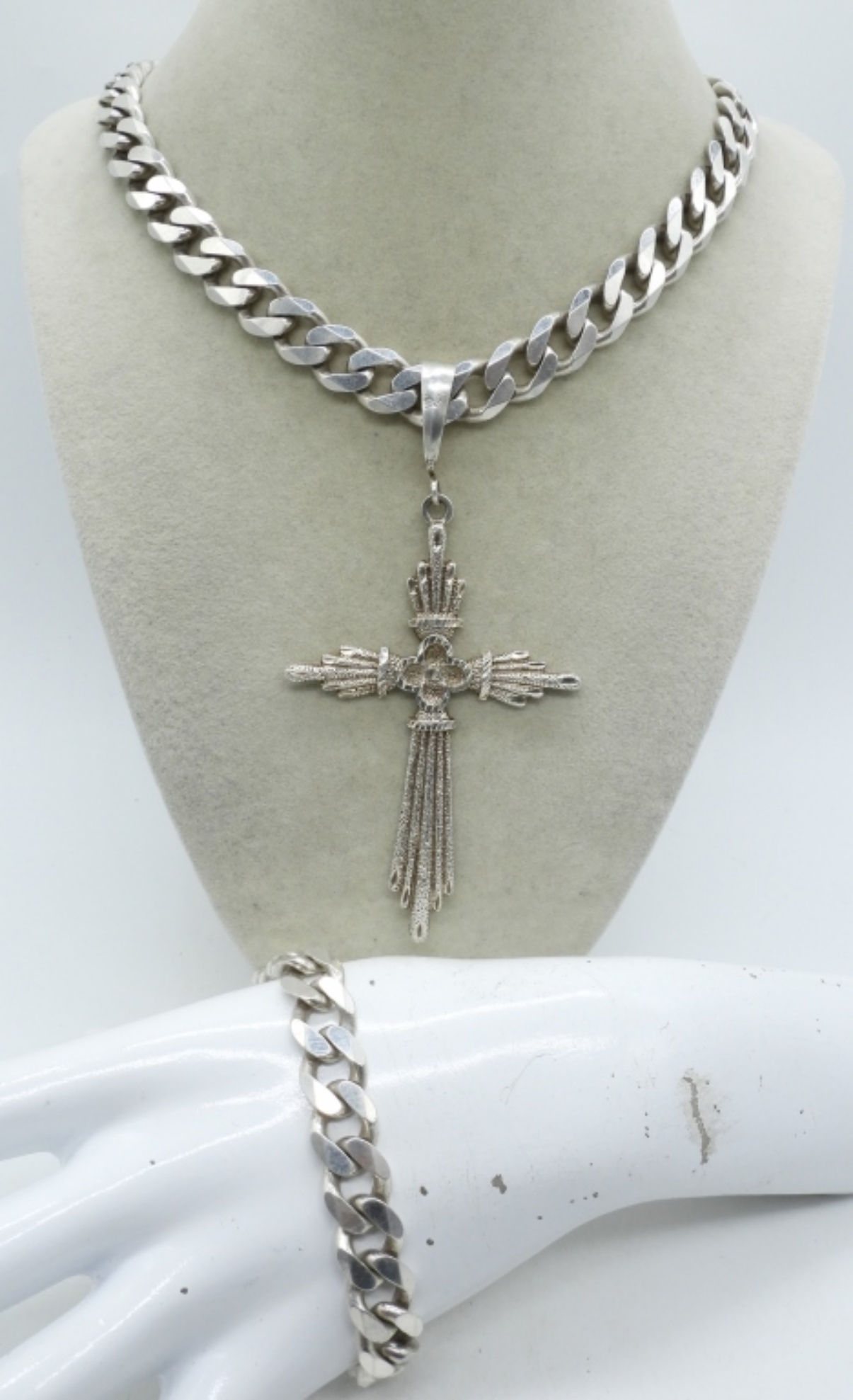 HUGE STERLING SILVER CROSS PENDANT AND SUPER THICK STERLING CHAIN. ALL VERY HEAVY! 4.5″ CHARM. 26″ CHAIN, CHAIN IS ALSO 1/2″ WIDE. MATCHING BRACELET 8″. (112.7 DWT)