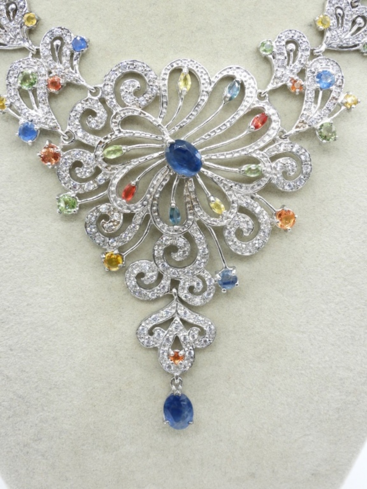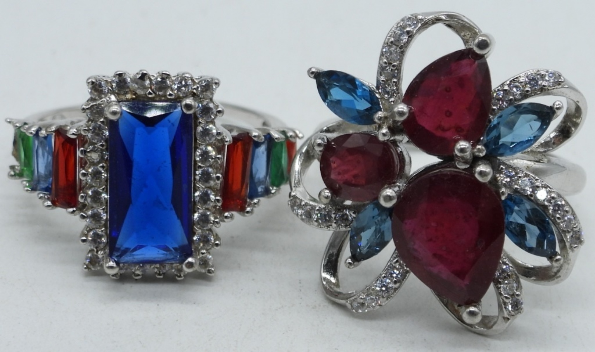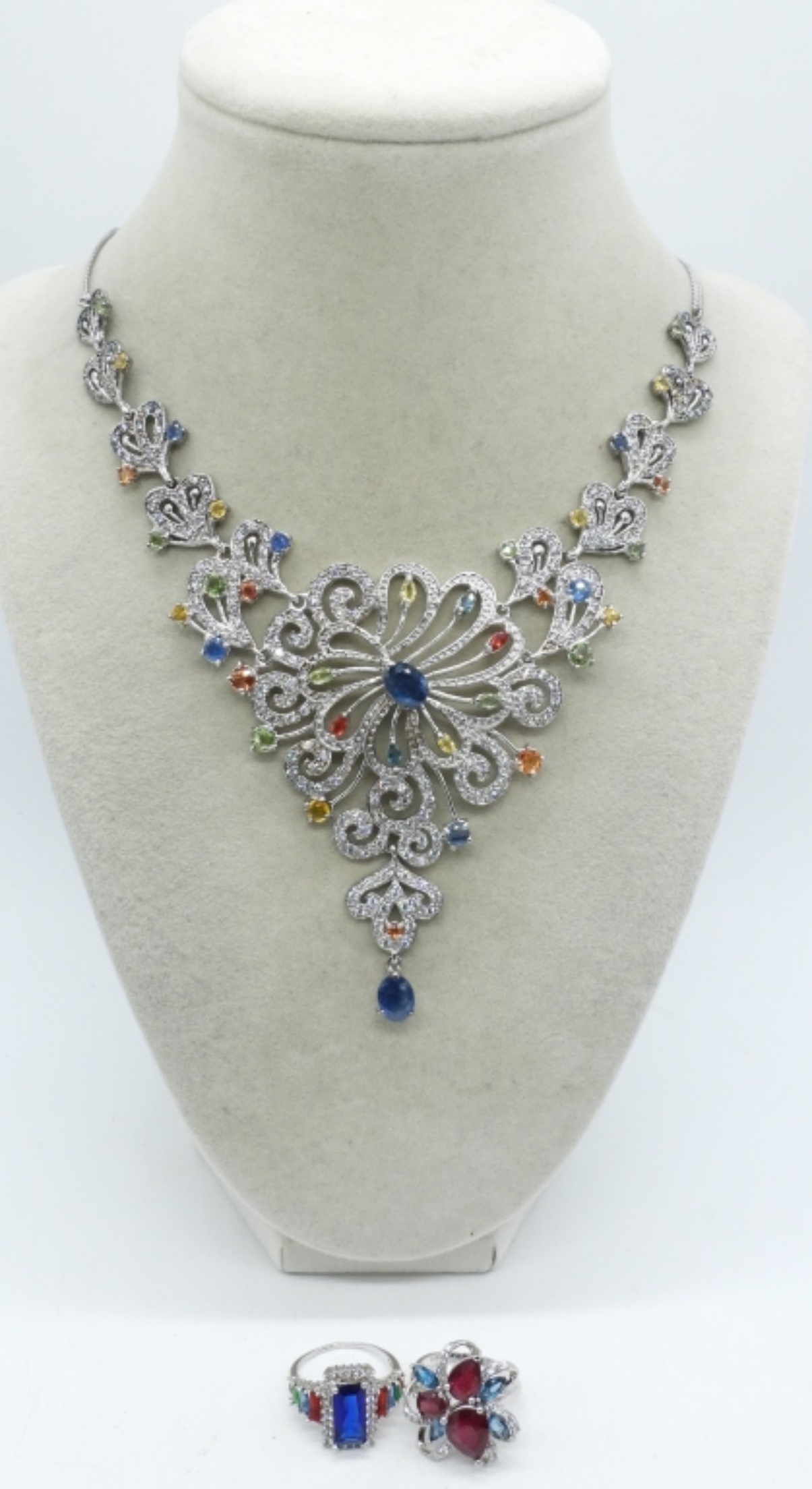 NECKLACE IS 18″. RINGS ARE SIZE 8. PROBABLY SYNTHETIC GEMSTONES. (32.5 DWT)