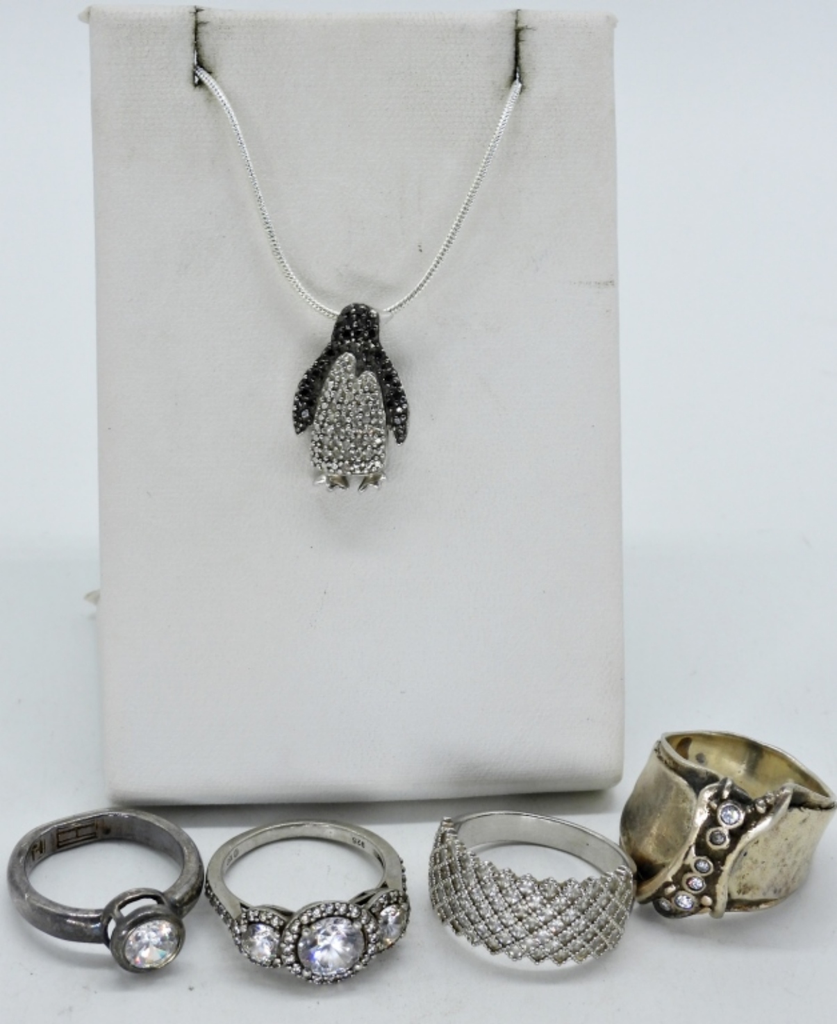 STERLING PENGUIN PENDANT ON A 925 16″ CHAIN. FOUR STERLING RINGS, SIZE 6-9 (20 DWT)