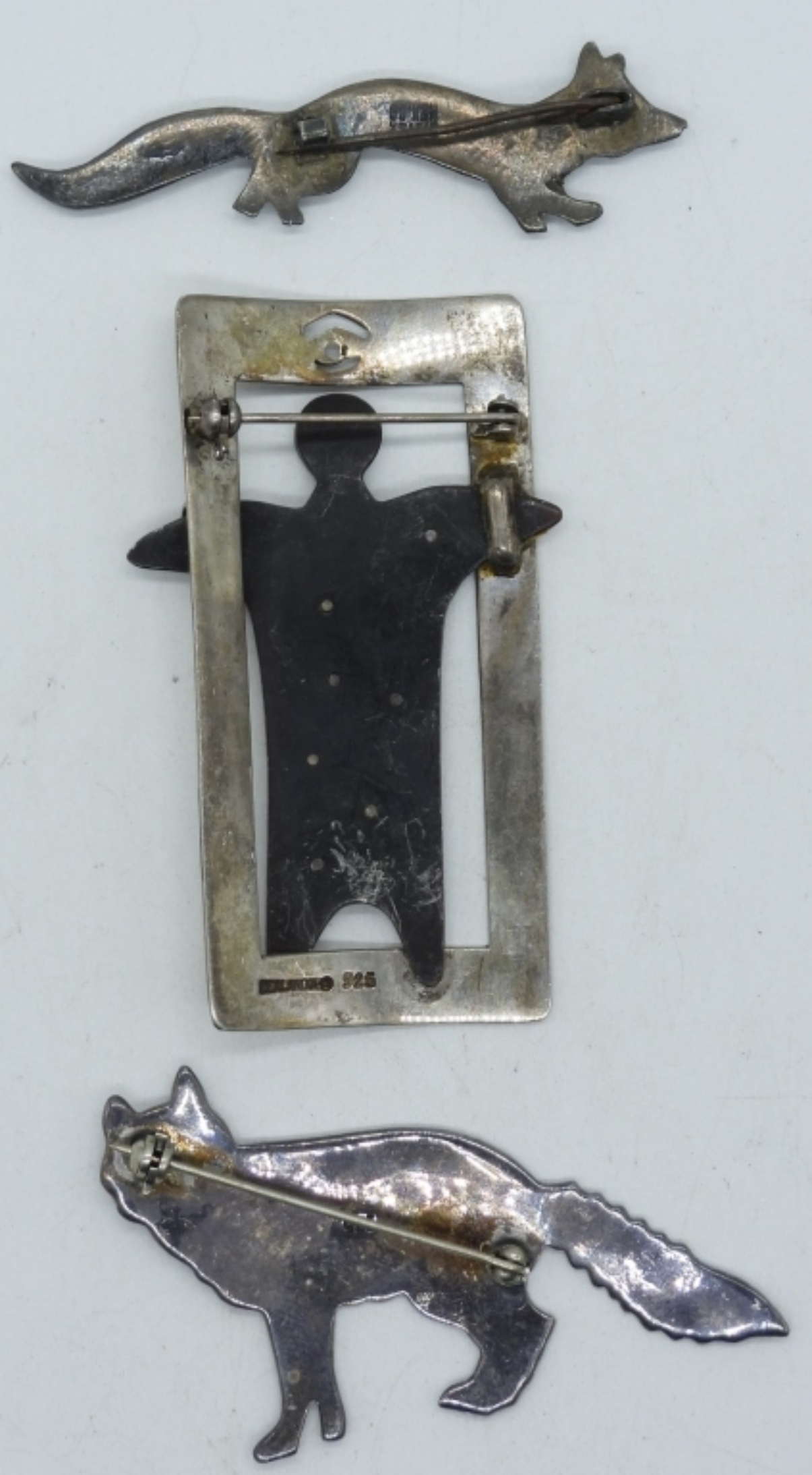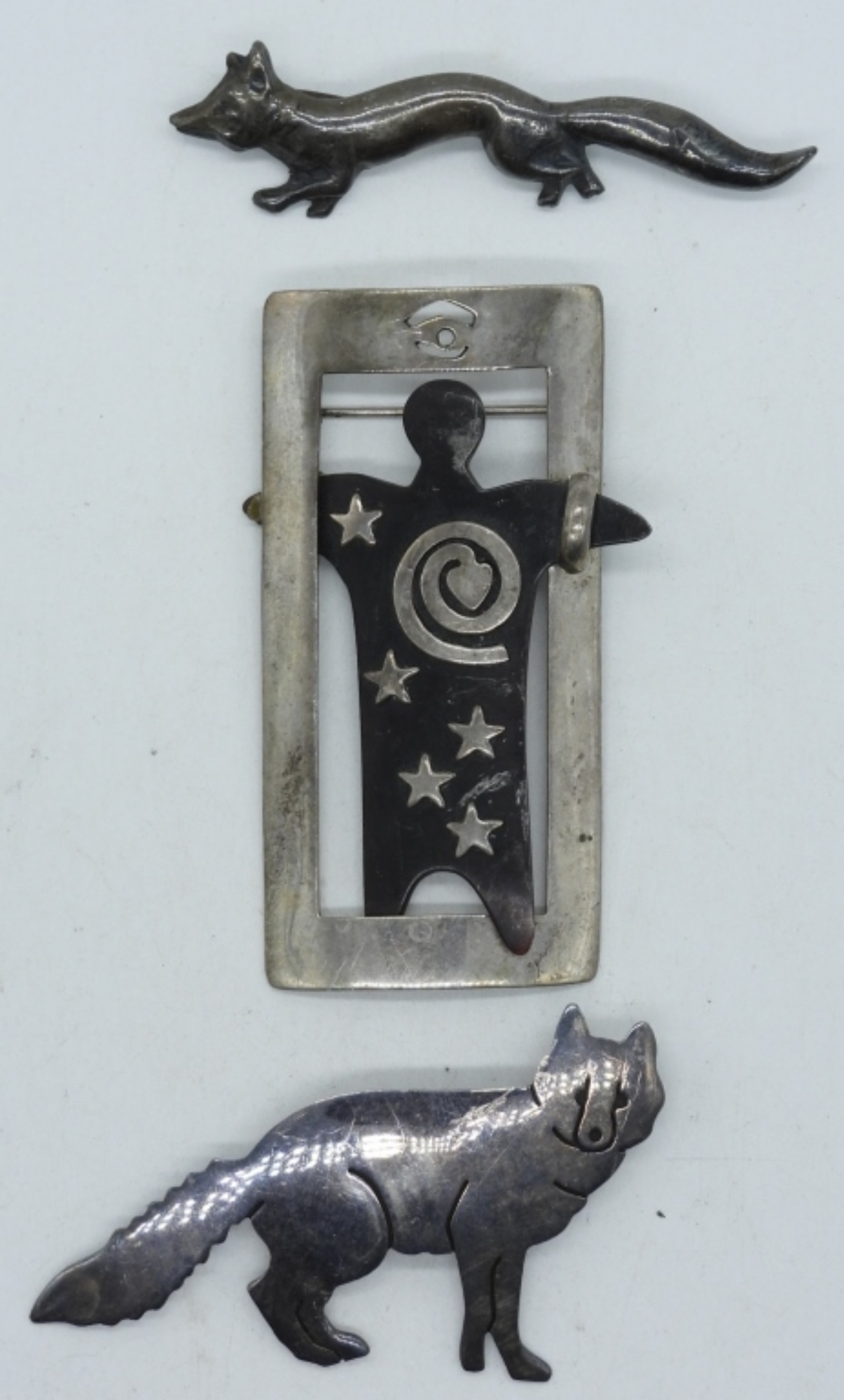 ZEALANDIA STERLING BROOCH, 2.5″ LONG. TWO FOX STERLING BROOCHES. (21.8 DWT)