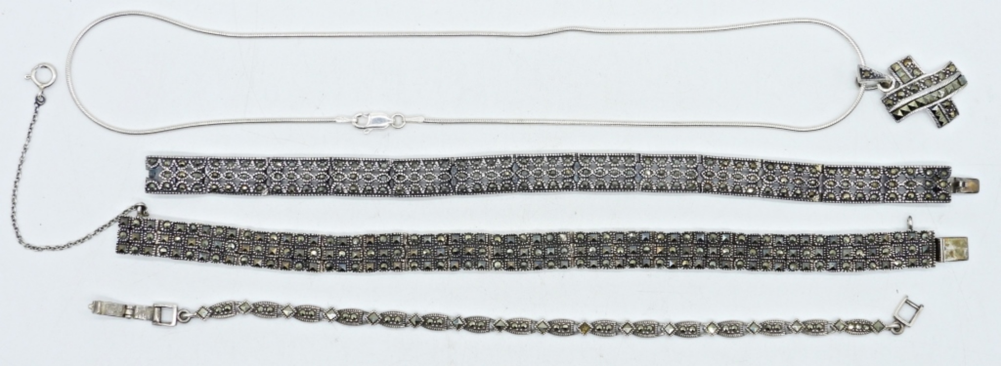 THREE STERLING MARCASITE BRACELETS, 7 – 7.5″. MARCASITE NECKLACE, 16″. (40.5 DWT)