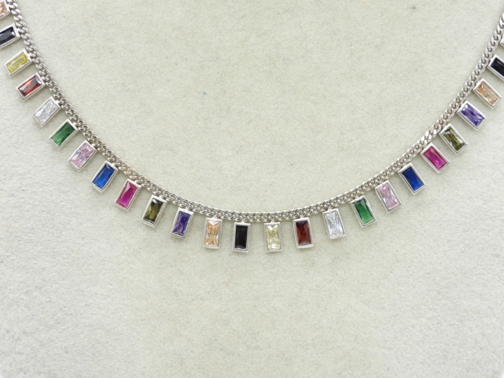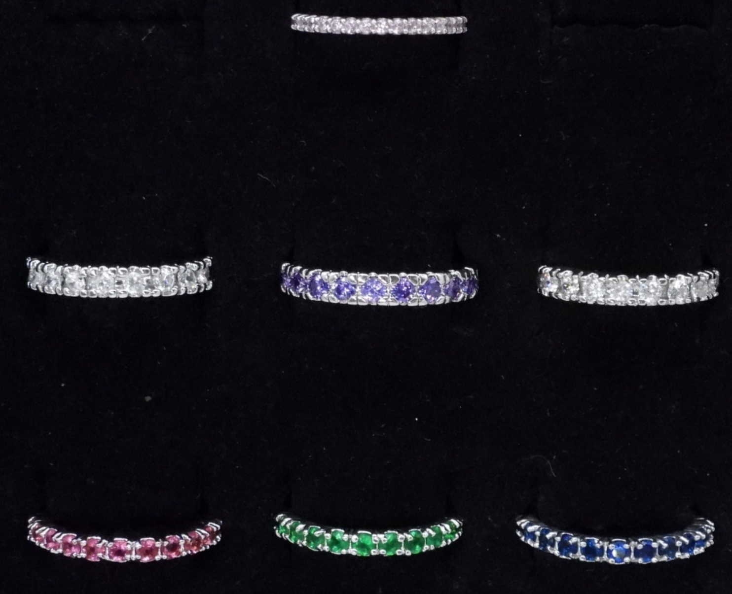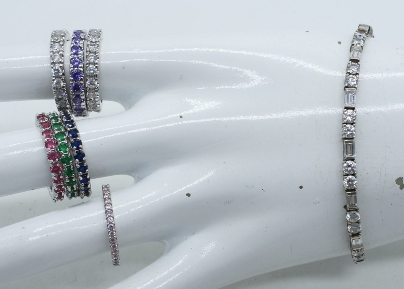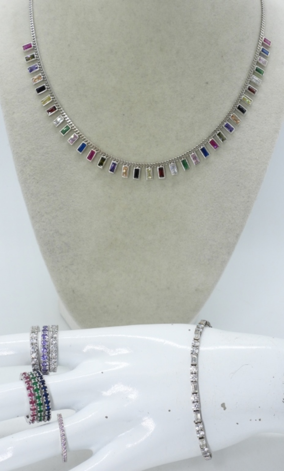 7 STERLING RINGS. SIMULATED DIAMOND, RUBY, SAPPHIRE, EMERALD & MORE. RINGS ARE SIZE 6 & 7. MULTI COLOR GEMSTONE NECKLACE, 18″ AND SIMULATED DIAMOND BRACELET 7″. (23 DWT)