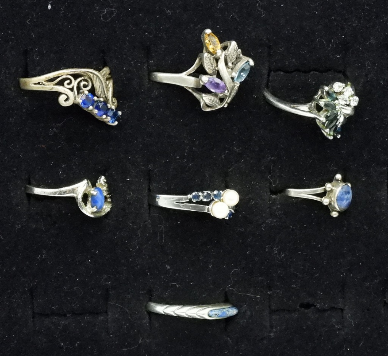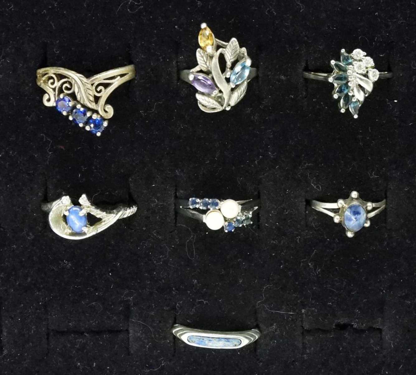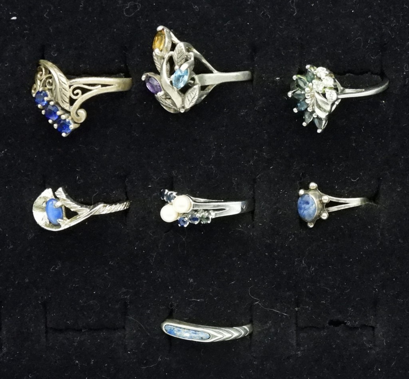SEVEN STERLING SAPPHIRE & LAPIS LAZULI RINGS. SIZES 5-10. (12.6 DWT)