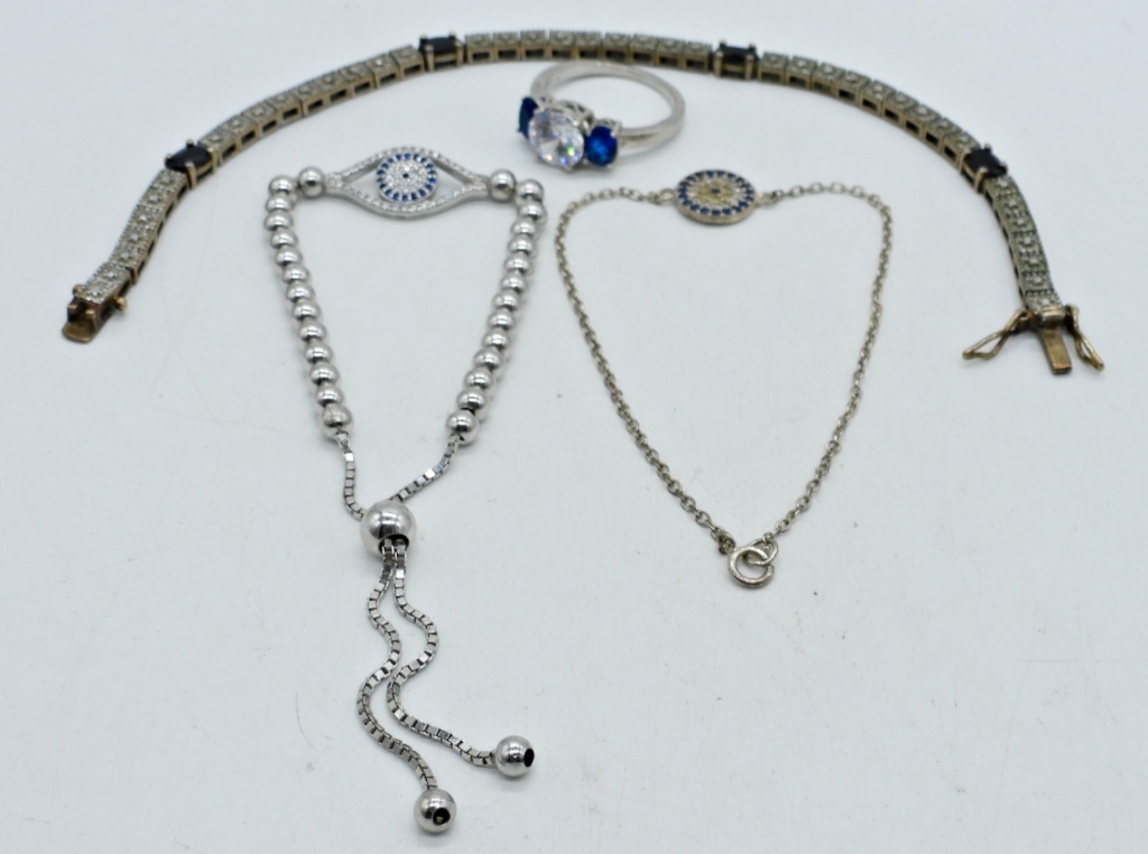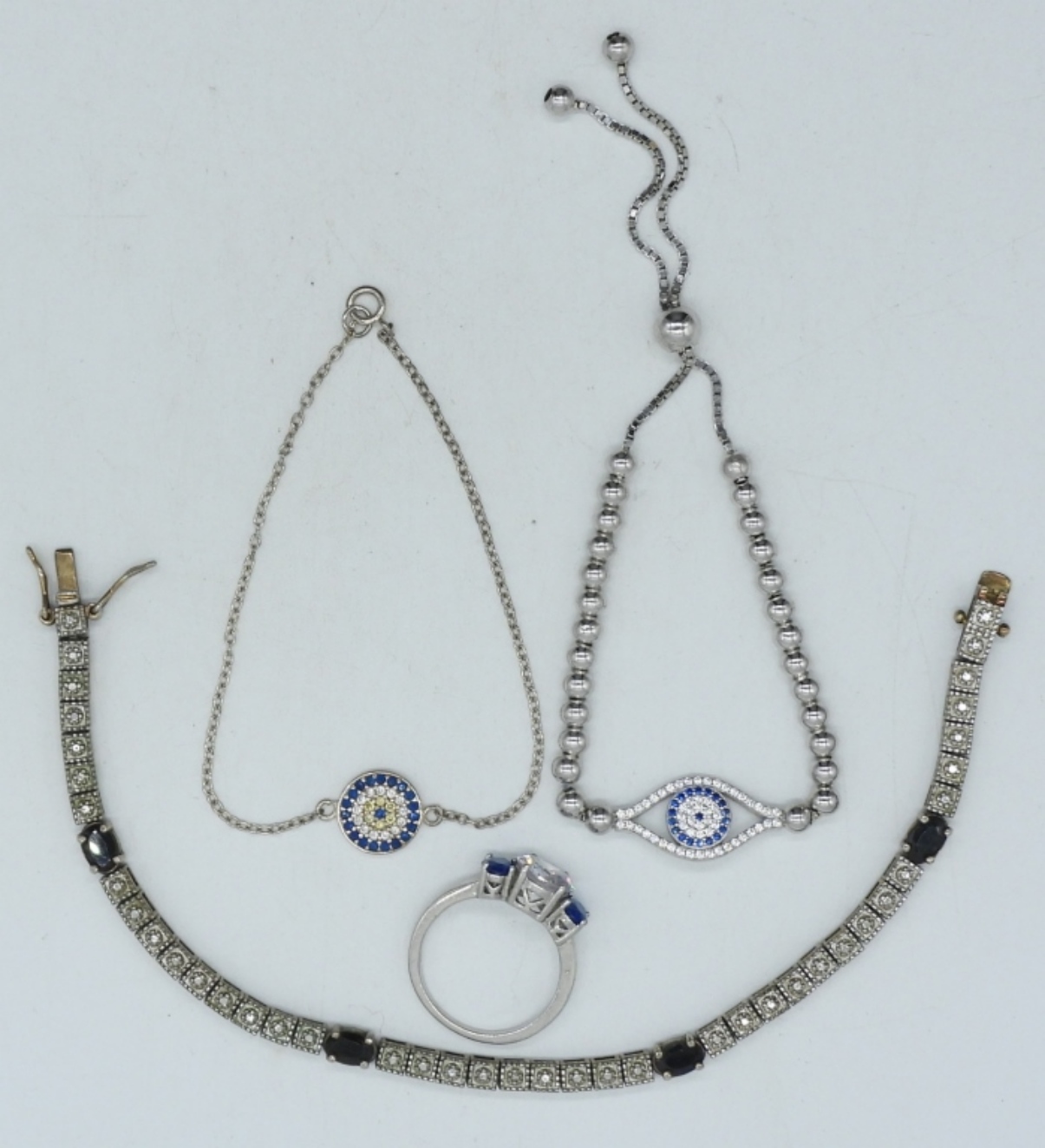 TWO EVIL EYE PROTECTION BRACELETS. SAPPHIRE TENNIS BRACELET, 7.5″. RING SIZE 7. (14.5 DWT)