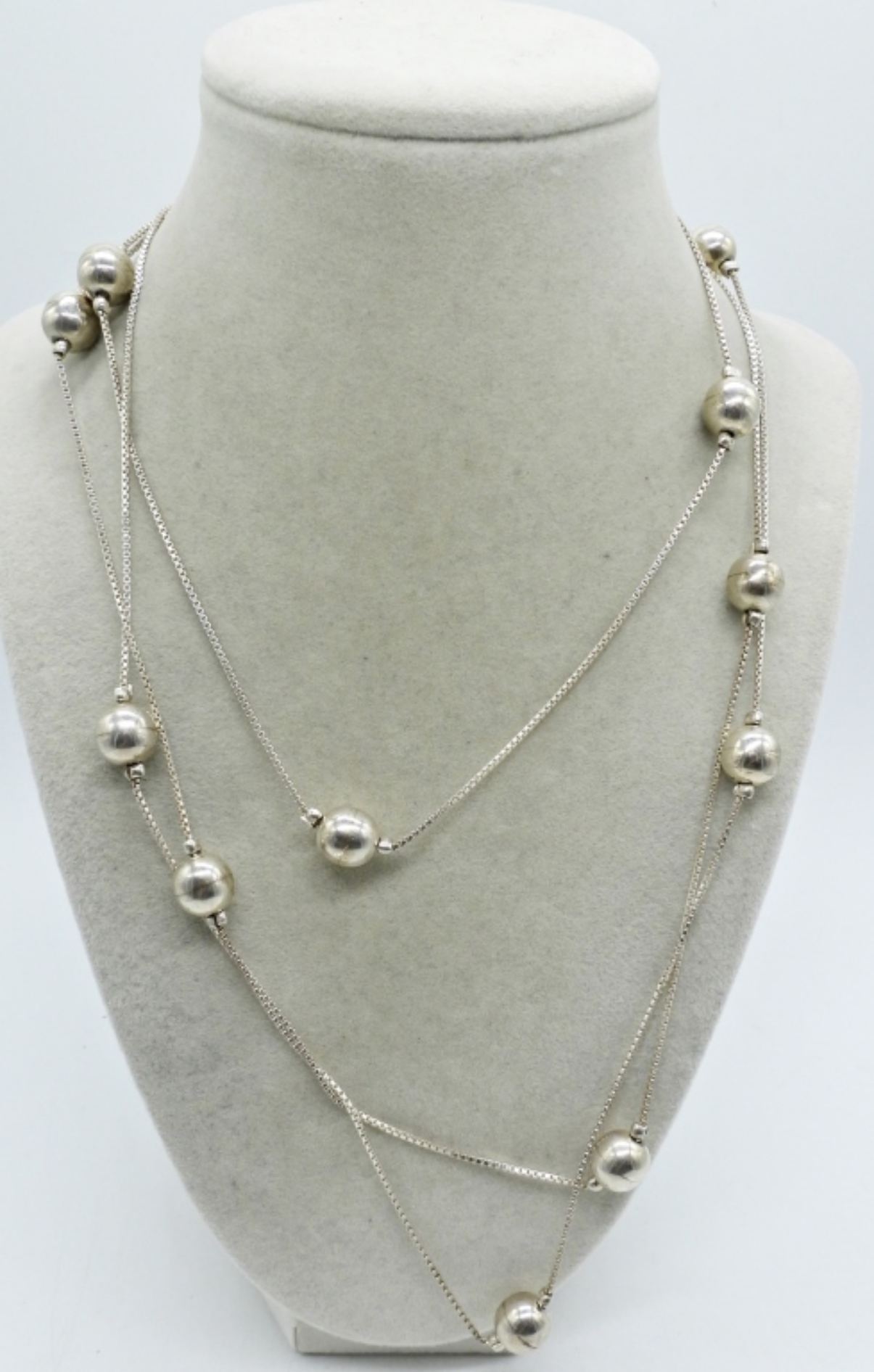 60″ STERLING CHAIN, FIXED BALL NECKLACE. IN GOOD SHAPE. (21.3 DWT)