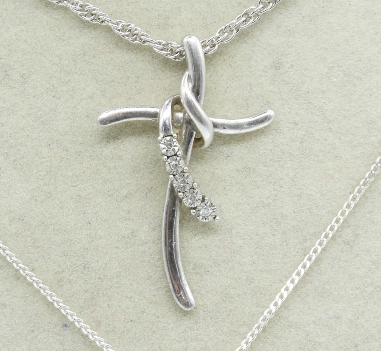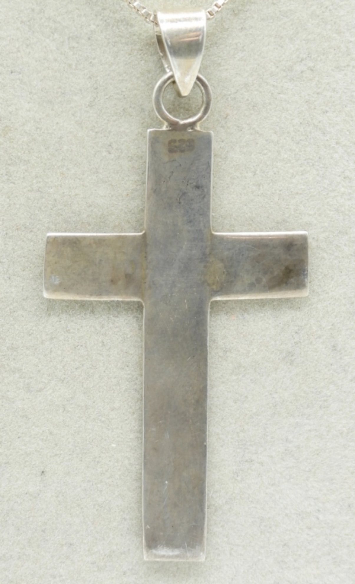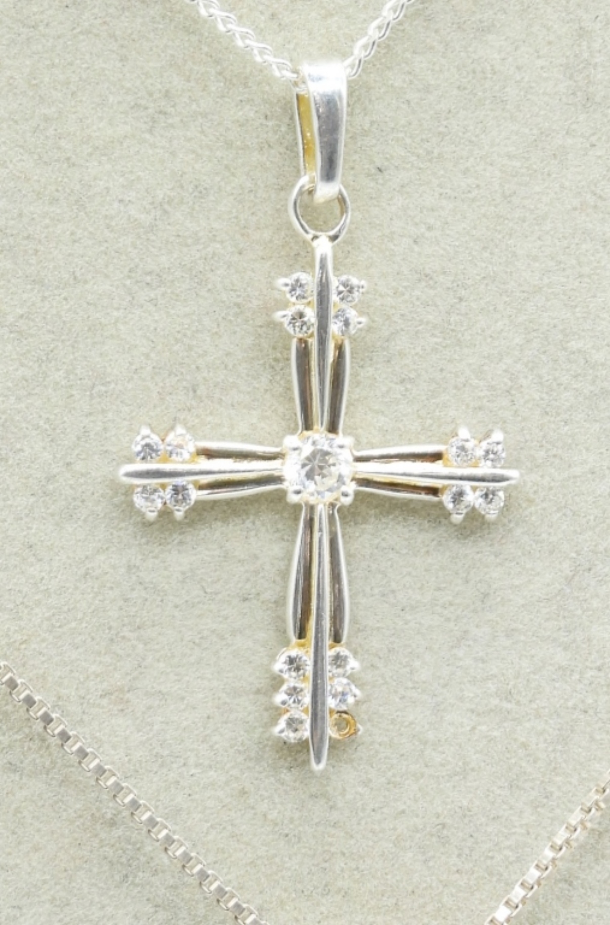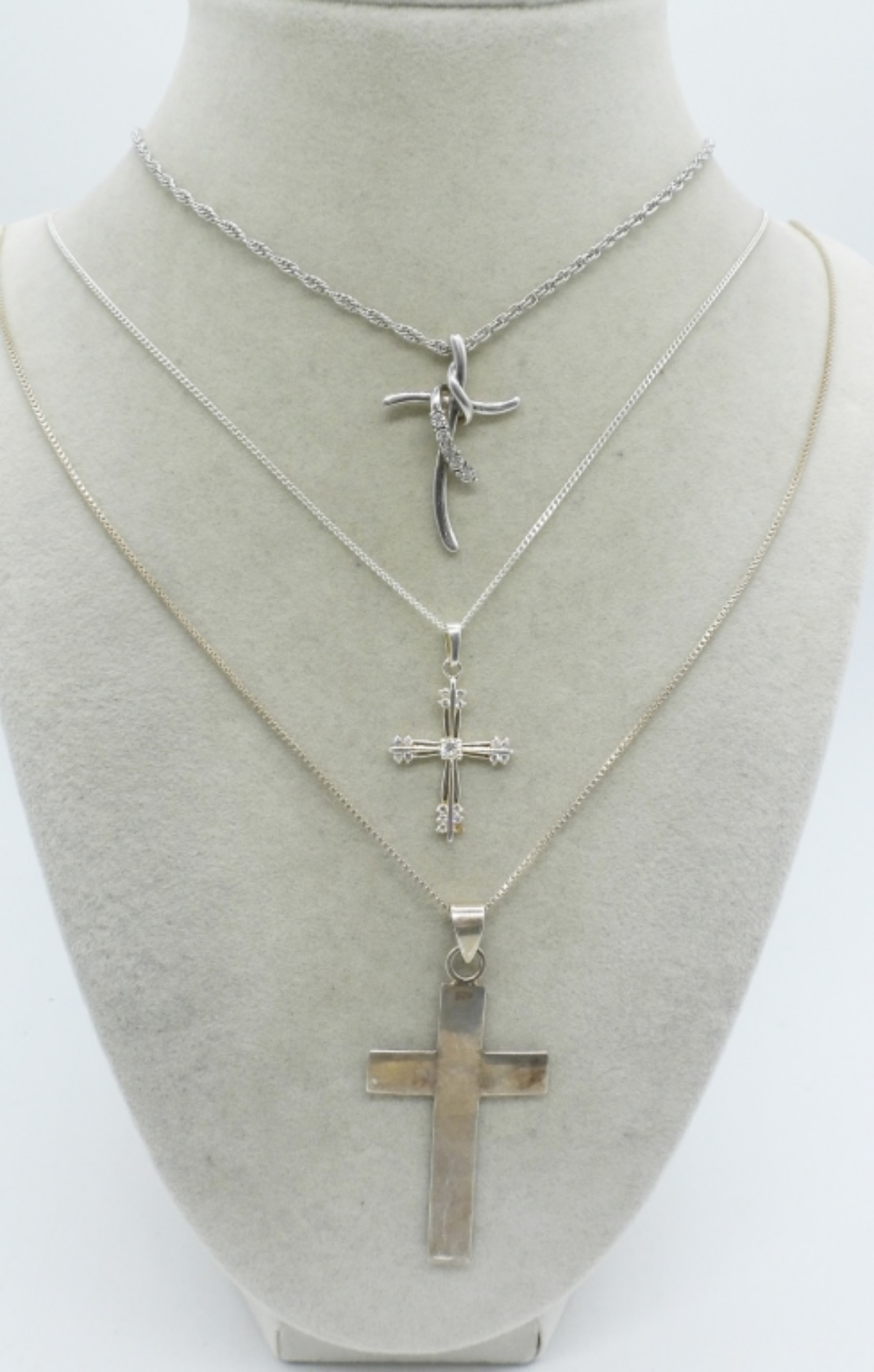 THREE STERLING CROSS NECKLACES. 17″, 18″, 30″. (11.5 DWT)