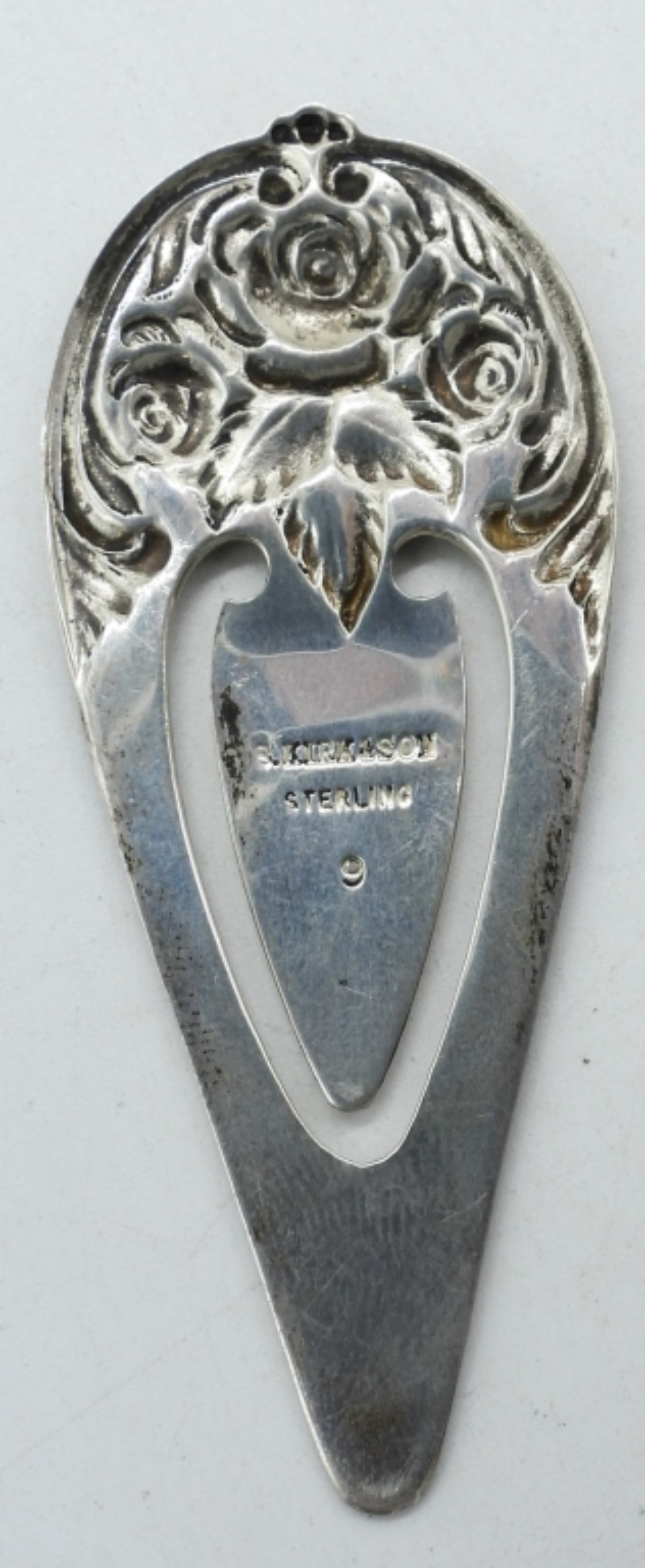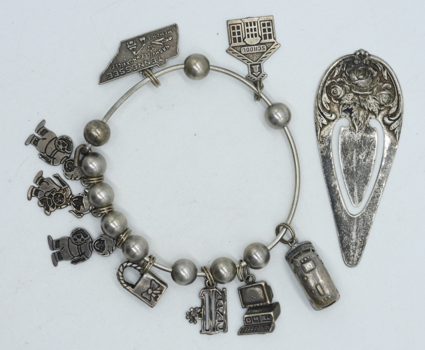 VINTAGE STERLING CHARM BRACELET, 9 CHARMS. STERLING BOOK MARK. (24.1 DWT)