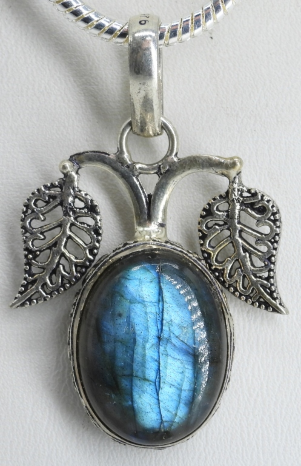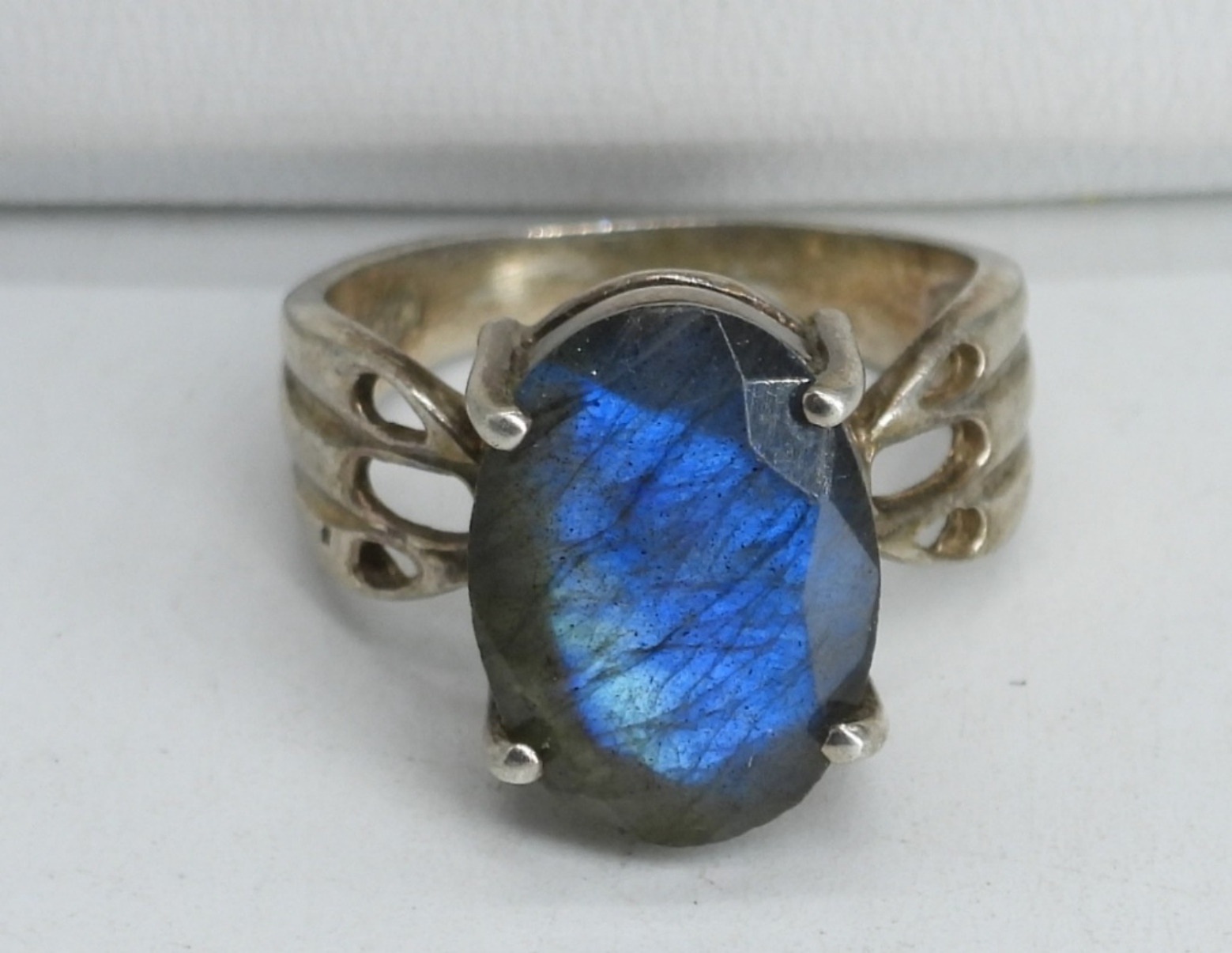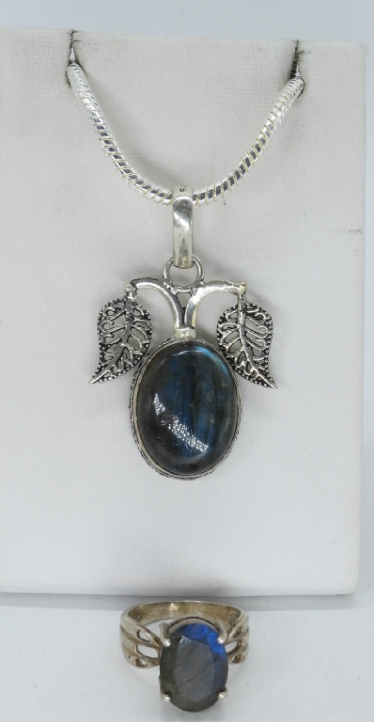STUNNING LABRADORITE GEMSTONES IN A STERLING RING, SIZE 5.5 AND NECKLACE. CHAIN IS 16″. (18 DWT)