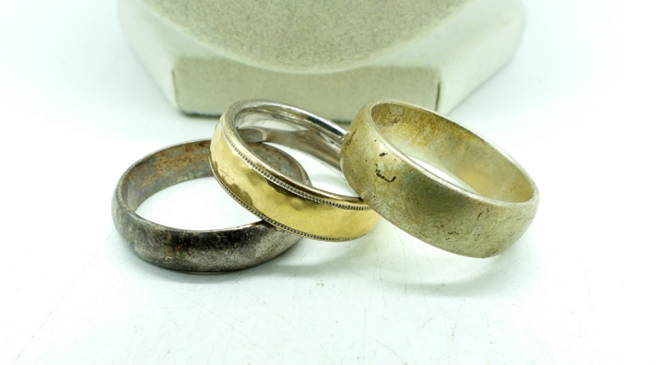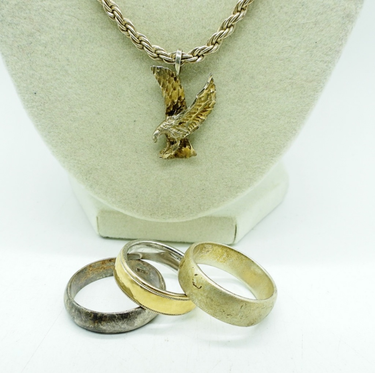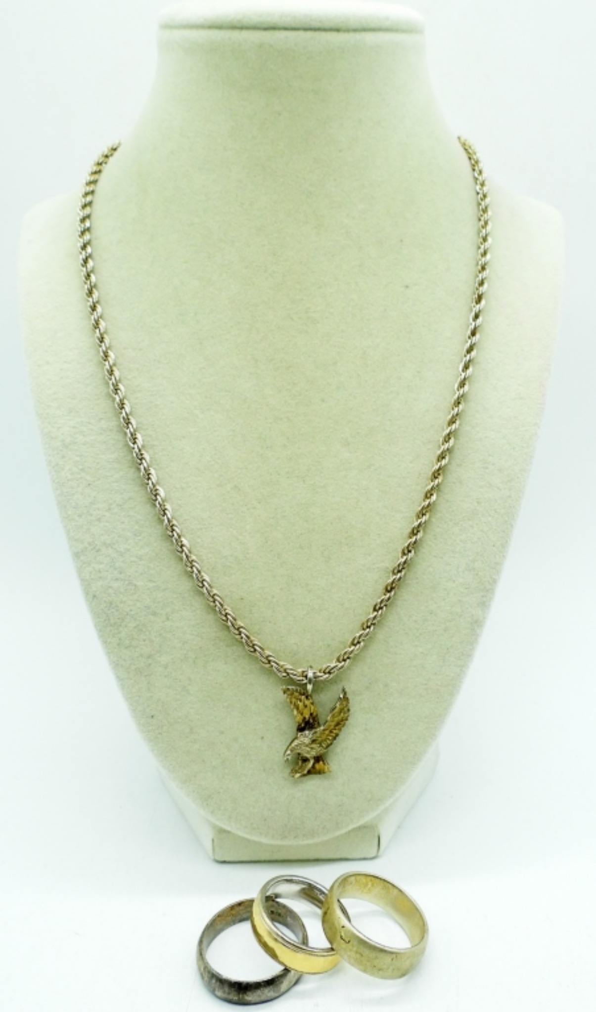STERLING MEN’S 20″ EAGLE NECKLACE. THREE STERLING RINGS, SIZES 10 & 13. 32.1 DWT