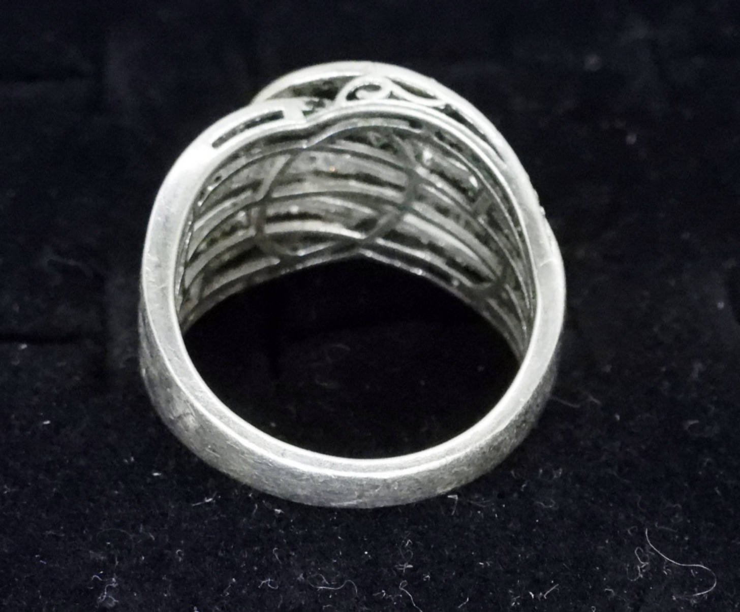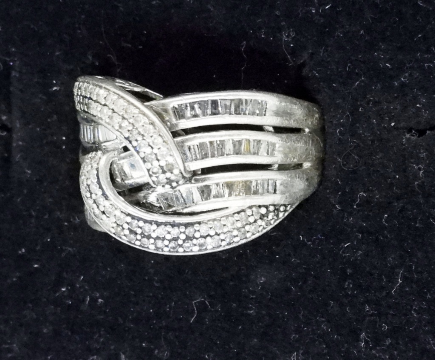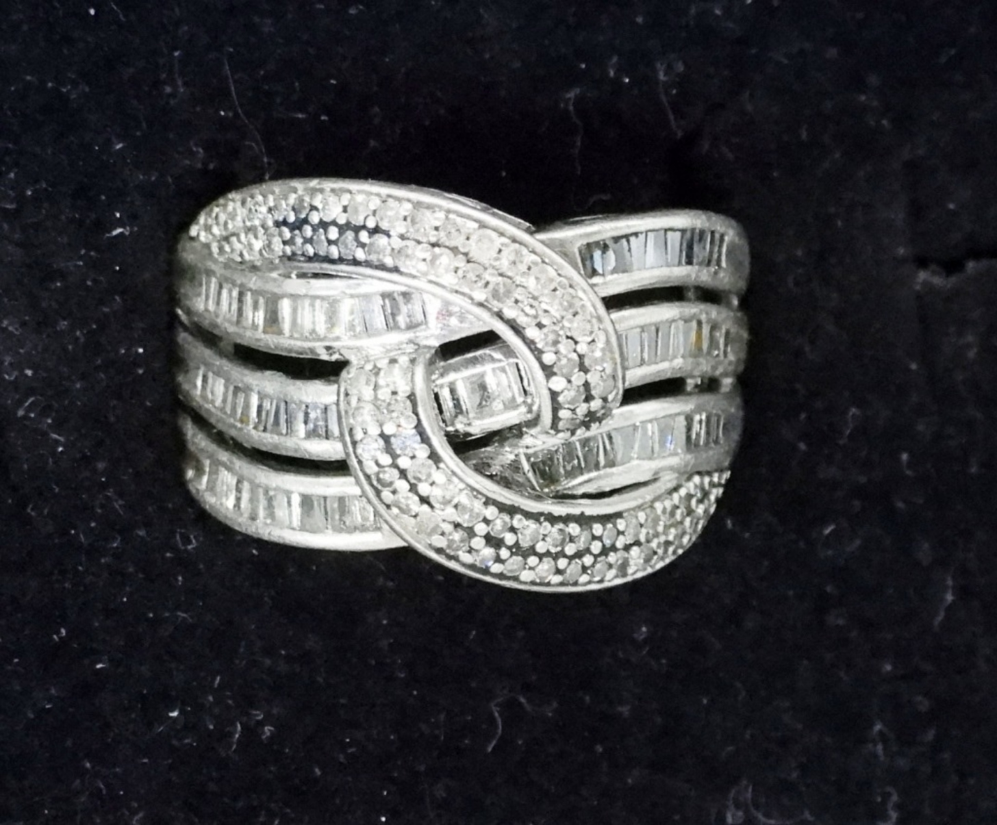 VERY PRETTY STERLING SILVER RING WITH A MIXTURE OF GENUINE DIAMOND AND MOISSANITE GEMSTONES. SIZE 10. (5.1 DWT)
