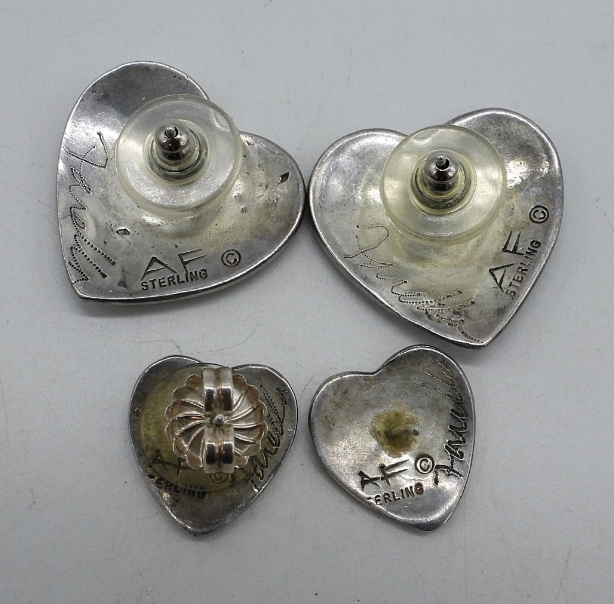 TWO HAND SHAPED PINS, BOTH SIGNED “AF STERLING”, 2.5″. TWO PAIR OF PIERCED EARRINGS, ALSO SIGNED “AF STERLING”, .5″ – 1″. STERLING HEART SHAPED PIN WITH SIGNATURE (NOT LEGIBLE) 1991 925. 2″. (33.4 DWT)