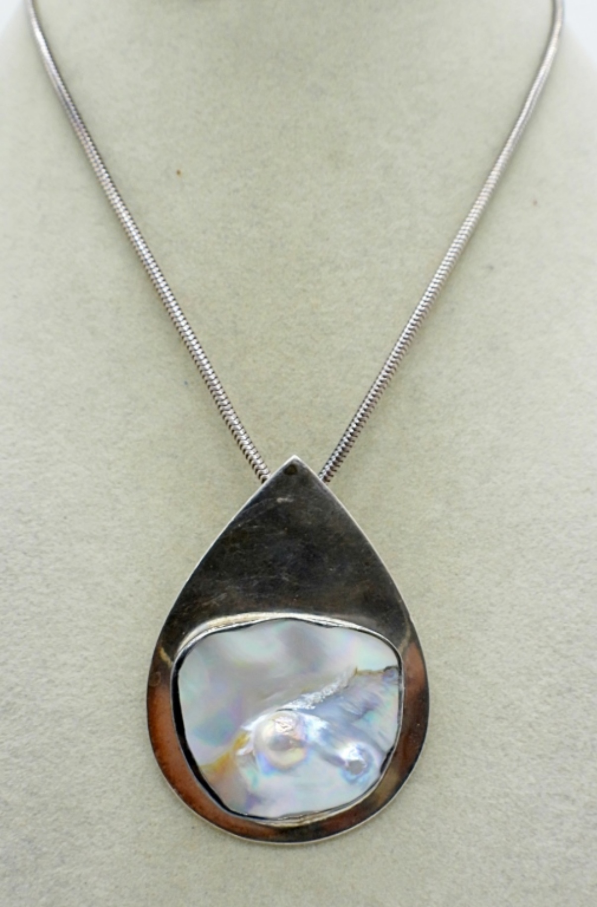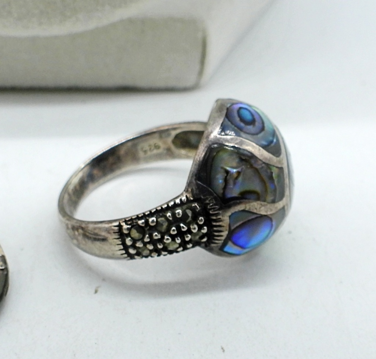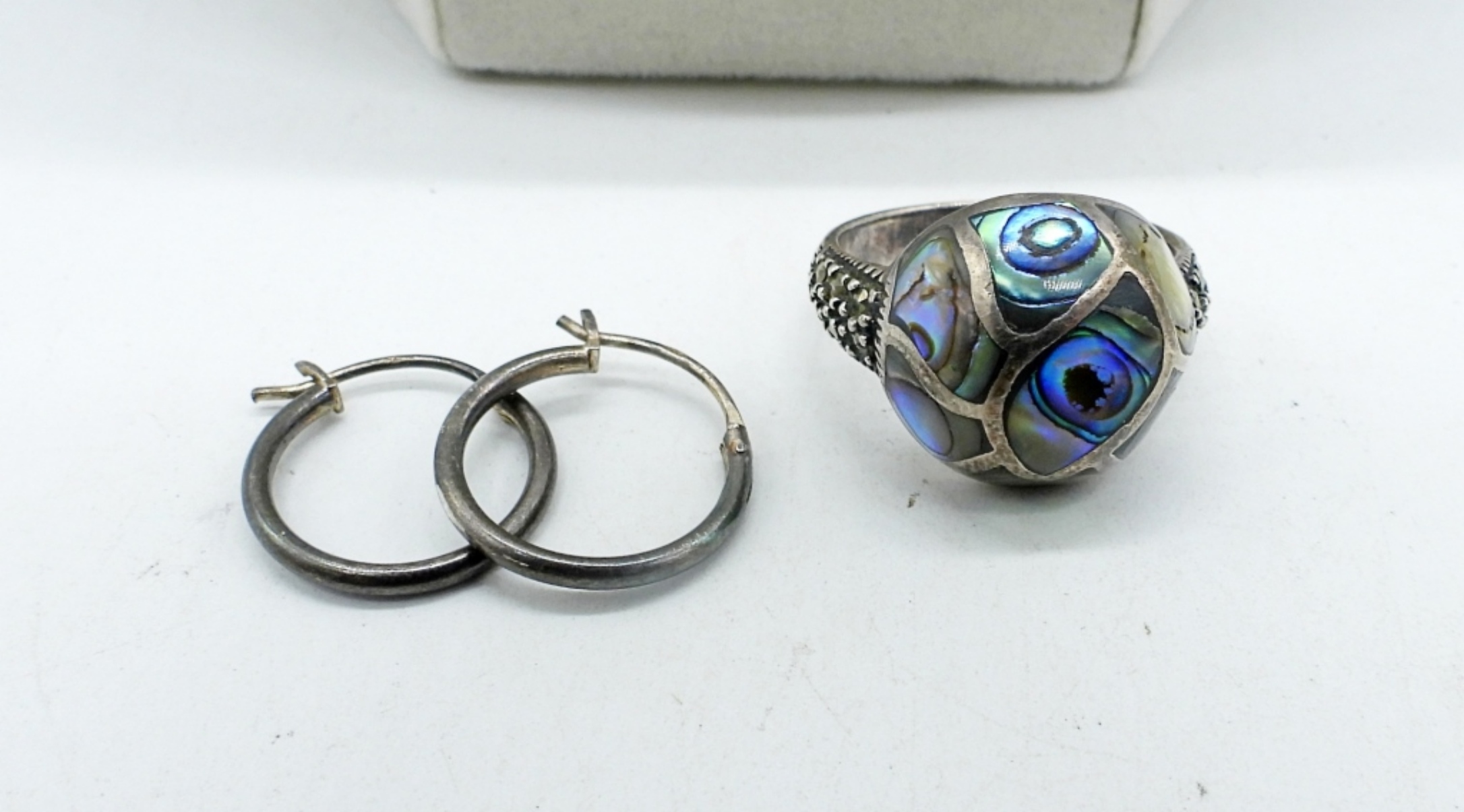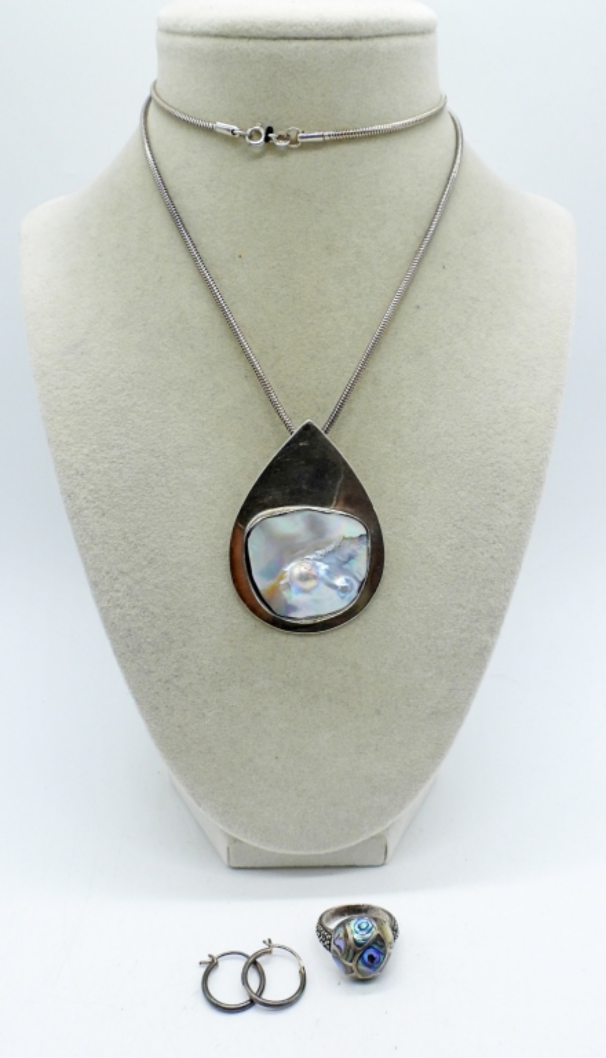STERLING SILVER BLISTER PEARL PENDANT (2″) ON A STERLING CHAIN (24″). STERLING MARCASITE / ABALONE RING SIZE 7. SMALL STERLING PIERCED HOOPS. (20.9 DWT)