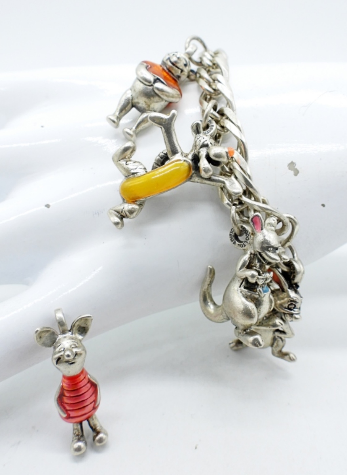 CHARM BRACELET, WINNIE THE POOH CHARACTERS IN STERLING & ENAMEL. PIGLET NEEDS TO BE REATTACHED. LIMITED EDITION. 7″, HEAVY. SEE PHOTOS!! (44 DWT)