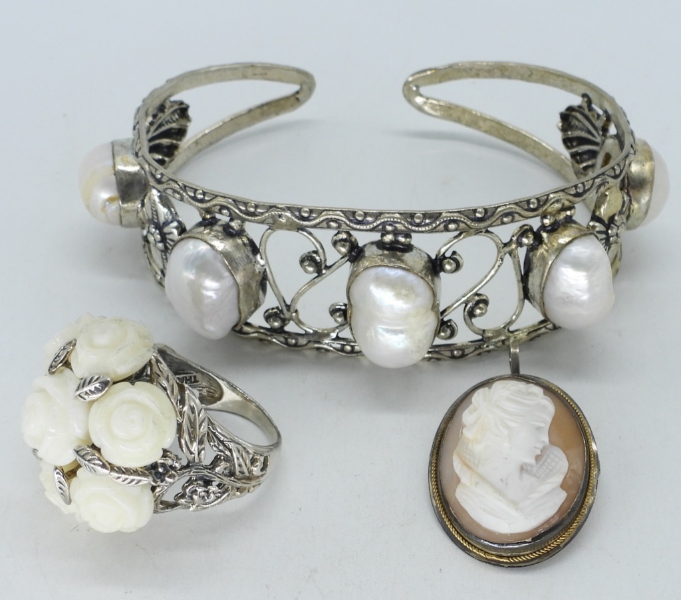 VINTAGE STERLING CAMEO PIN / PENDANT, 1 1/4″ LONG. MOTHER OF PEARL ROSES RING, SIZE 8. STERLING MOTHER OF PEARL GEMSTONE CUFF BRACELET. 7″ W/OUT GAP. (31 DWT)