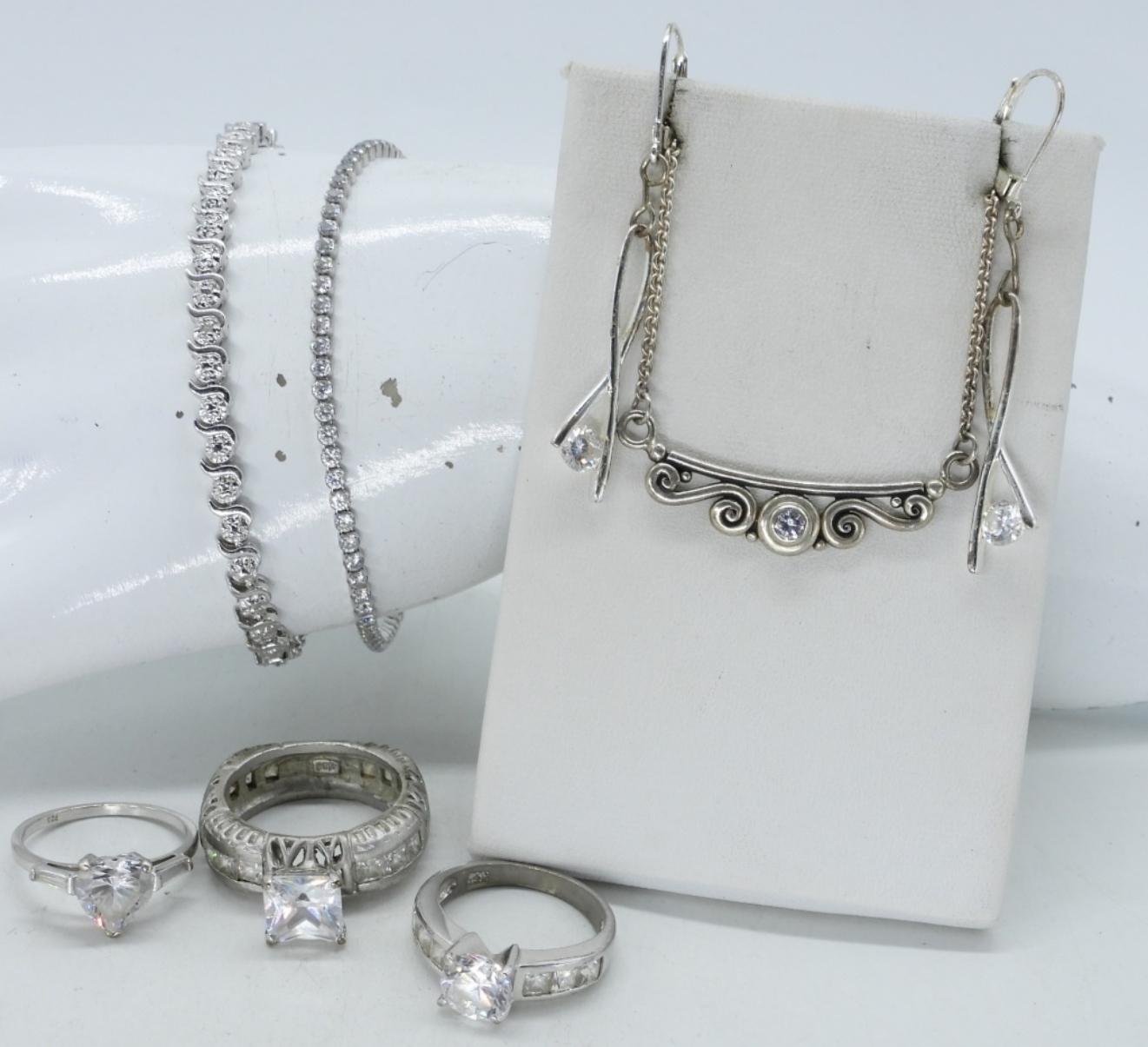 TWO BRACELETS, 7″. THREE RINGS, SIZES 7 & 9. ONE PAIR PIERCED DANGLE EARRINGS, 2″. PRETTY SIMPLE SCROLL WORK NECKLACE, 18″. (25.5 DWT)