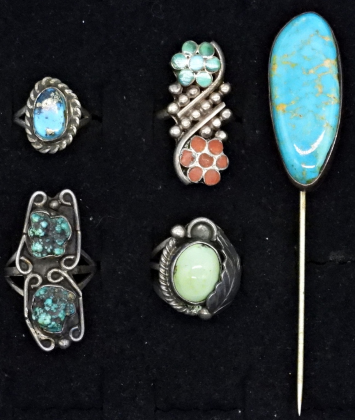 VINTAGE STERLING TURQUOISE RINGS, SIZES 3, 4, 5, 6. VINTAGE STERLING STICK PIN, TURQUOISE MEASURES 1.5″ LONG. PIN IN TOTAL IS 3.5″. (20.6 DWT)
