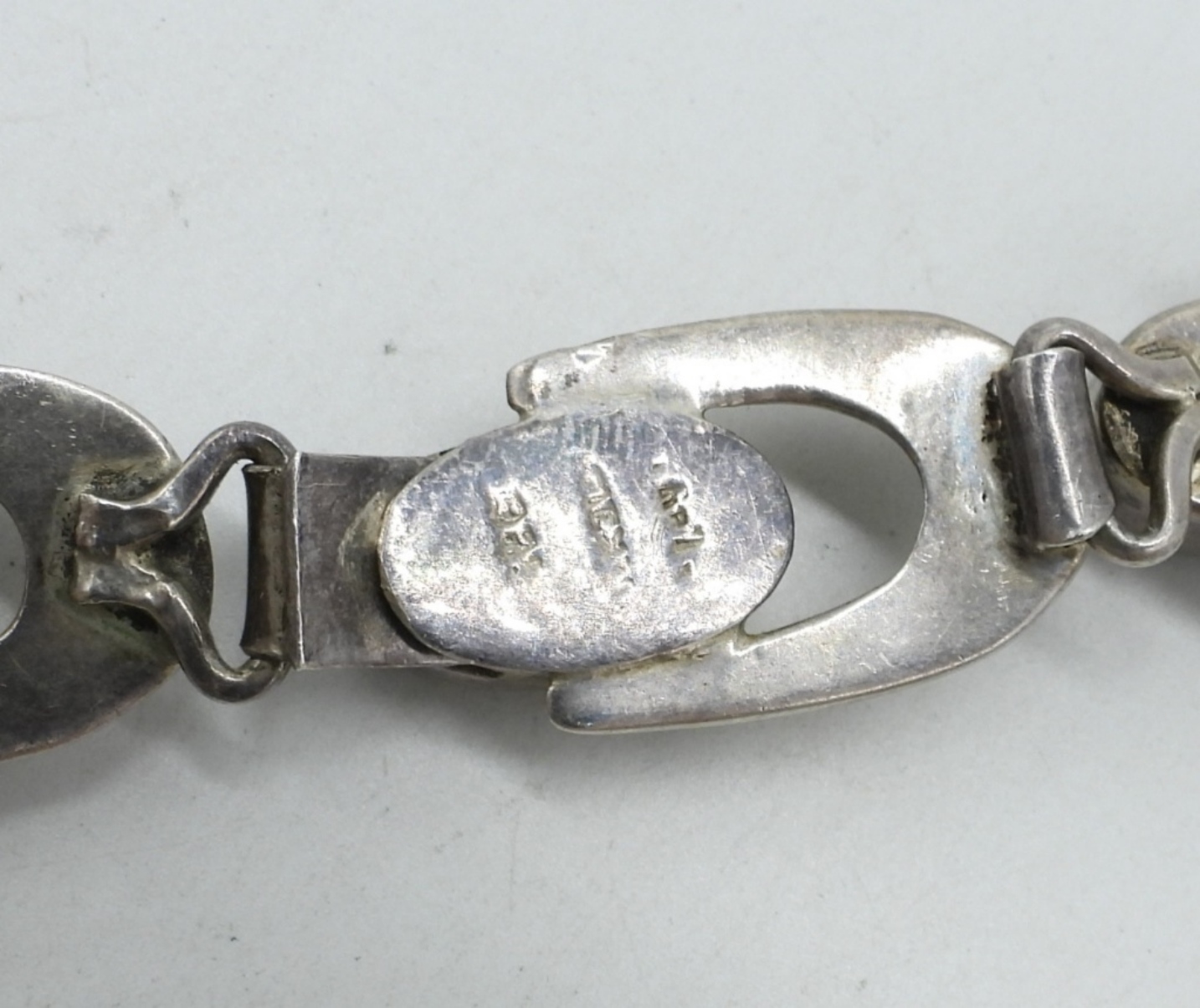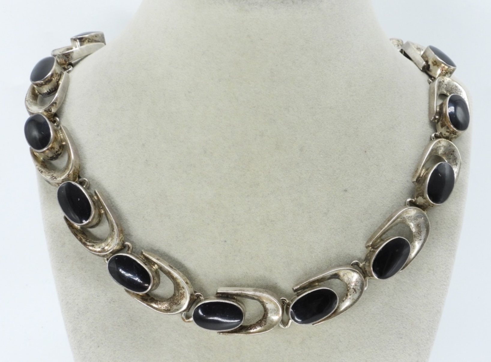 LARGE, HEAVY VINTAGE TAXCO BLACK ONYX STERLING NECKLACE. MARKINGS ARE WORN AND HARD TO READ. 925 MEXICO TR-??. SEE PHOTOS. CLASP WORKS. APPROX 19″. (103 DWT)