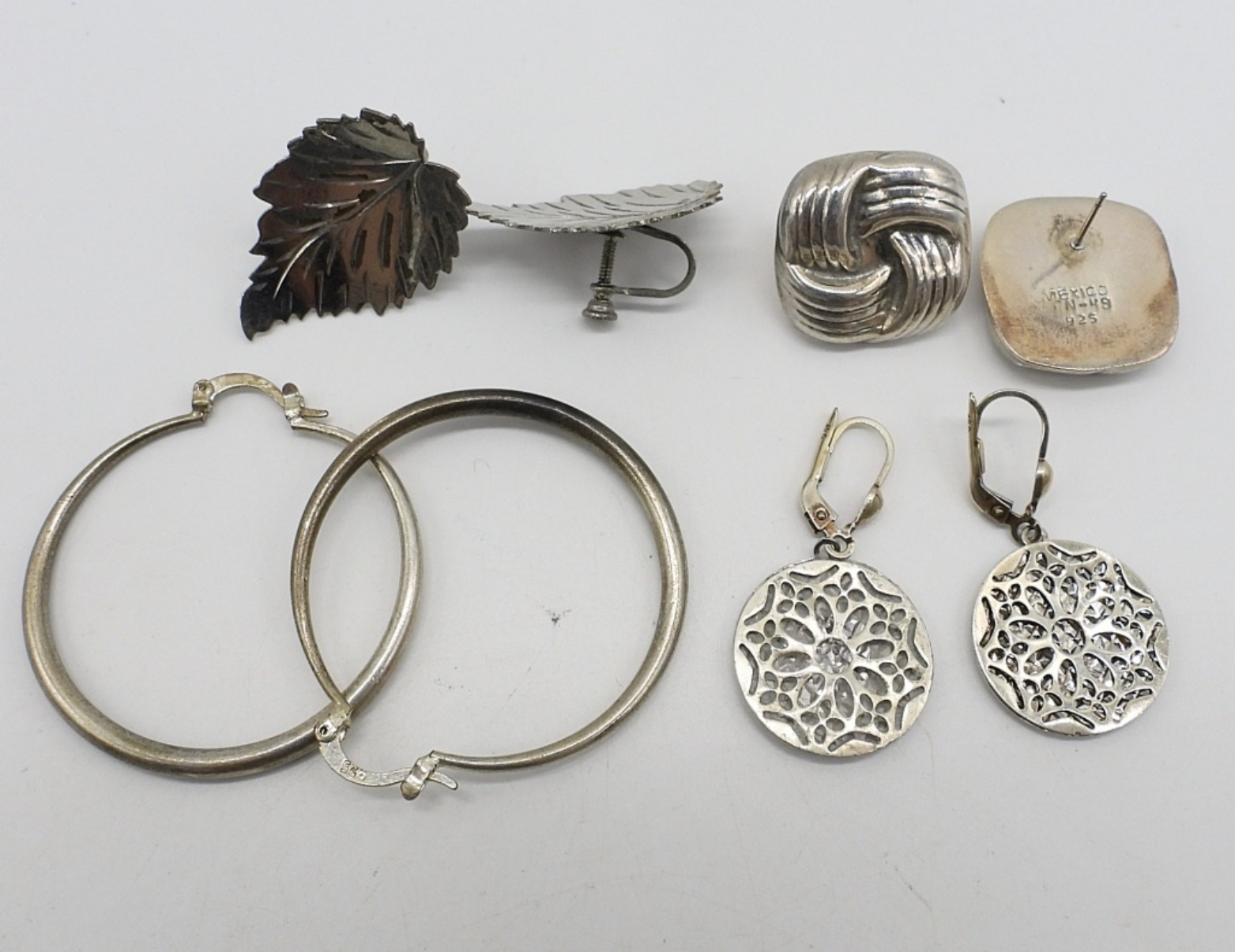 SQUARE STERLING TAXCO EARRINGS (TN-49 MEXICO 925) NO BACKS. THREE OTHER PAIR OF PIERCED STERLING EARRINGS. (16.5 DWT)