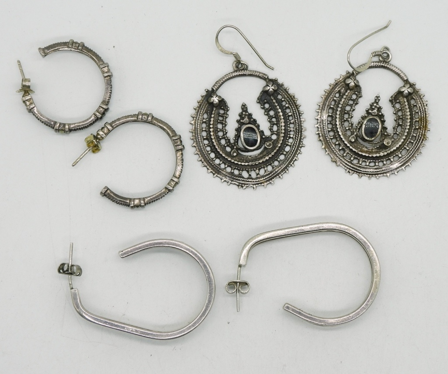 THREE PAIR OF STERLING PIERCED EARRINGS. MARCASITE & BLACK ONYX. 1-2″ (25.2 DWT)