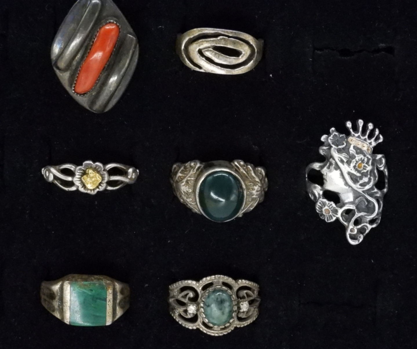 SEVEN VINTAGE STERLING FASHION RINGS. SIZES 5-9 (26.5 DWT)
