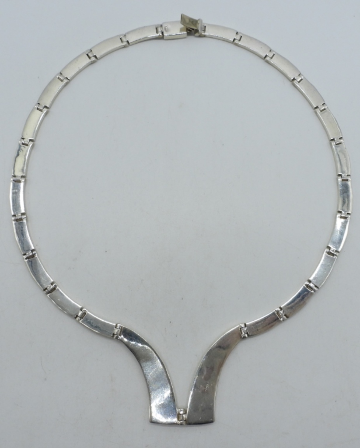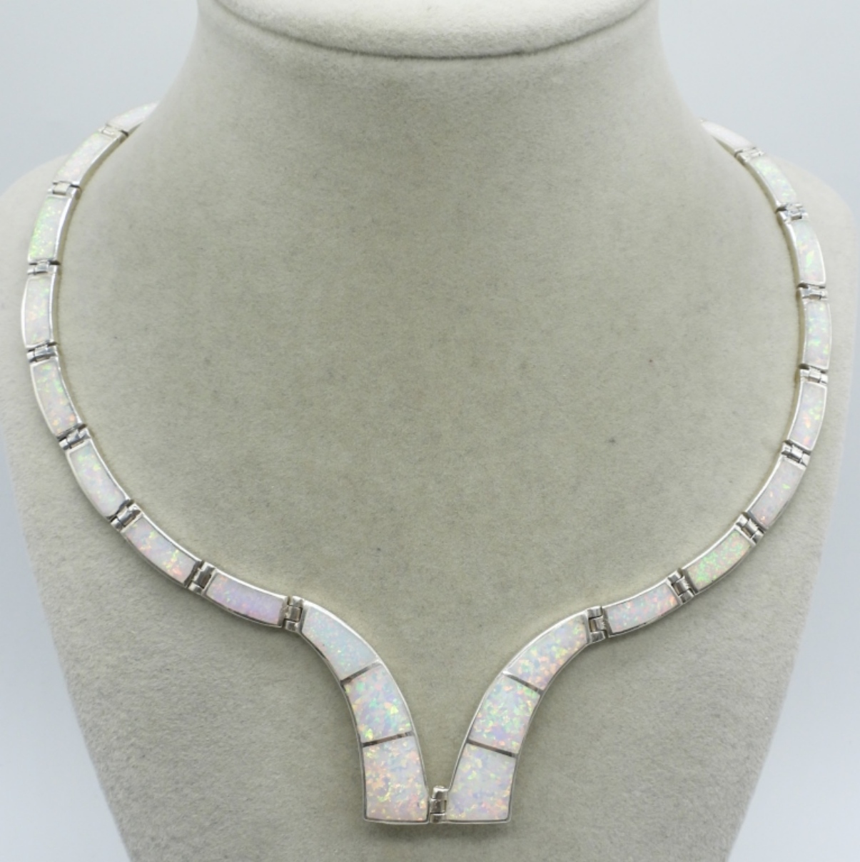 STERLING SILVER, OPAL INLAY COLLAR STYLE NECKLACE. LOTS OF SPARKLE, PINK & GREENS. APPROX 14″. LOTS OF HINGES! (26 DWT)