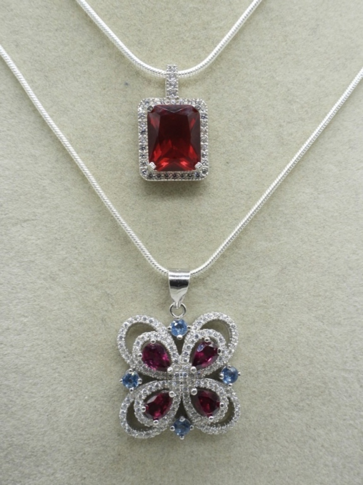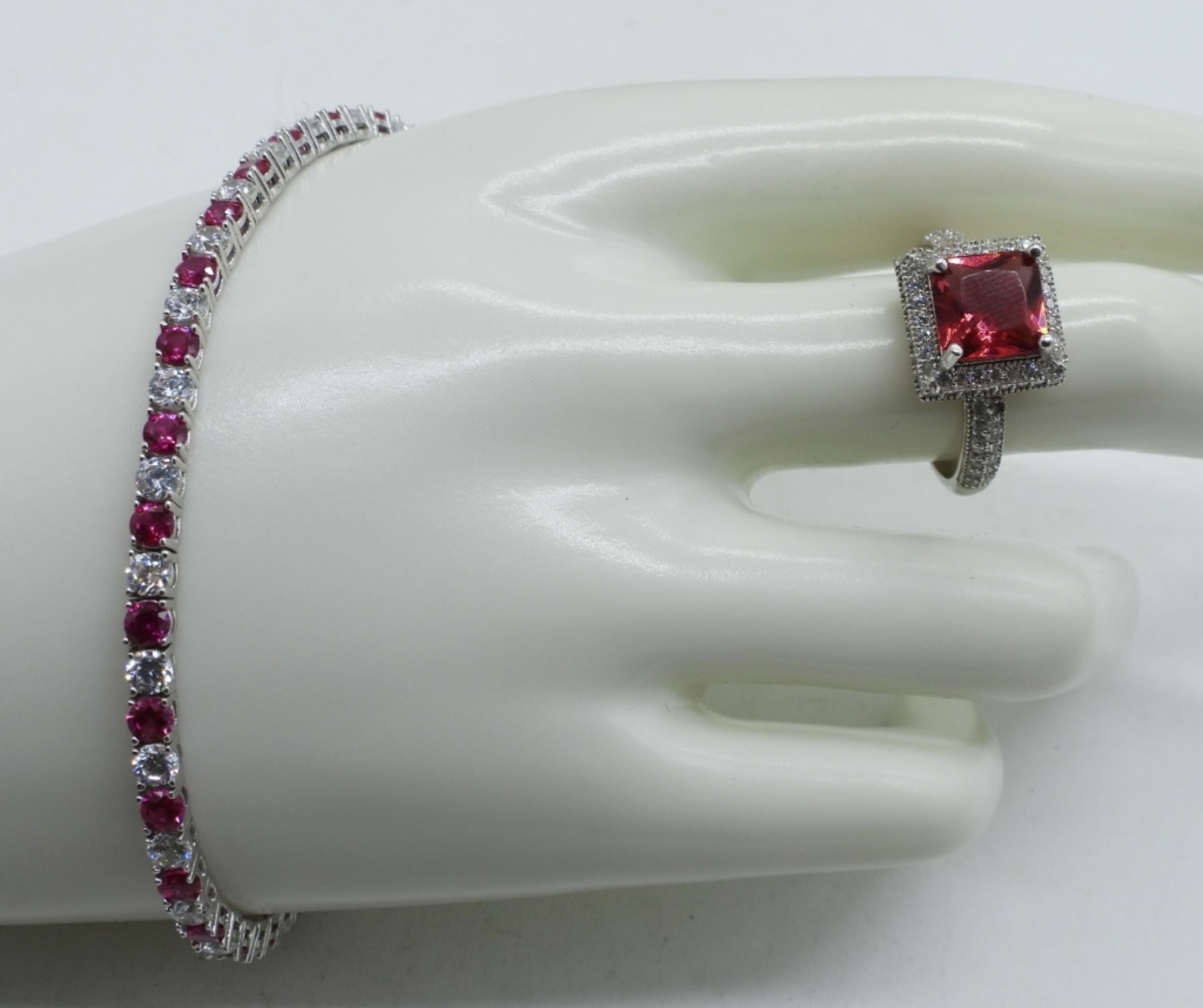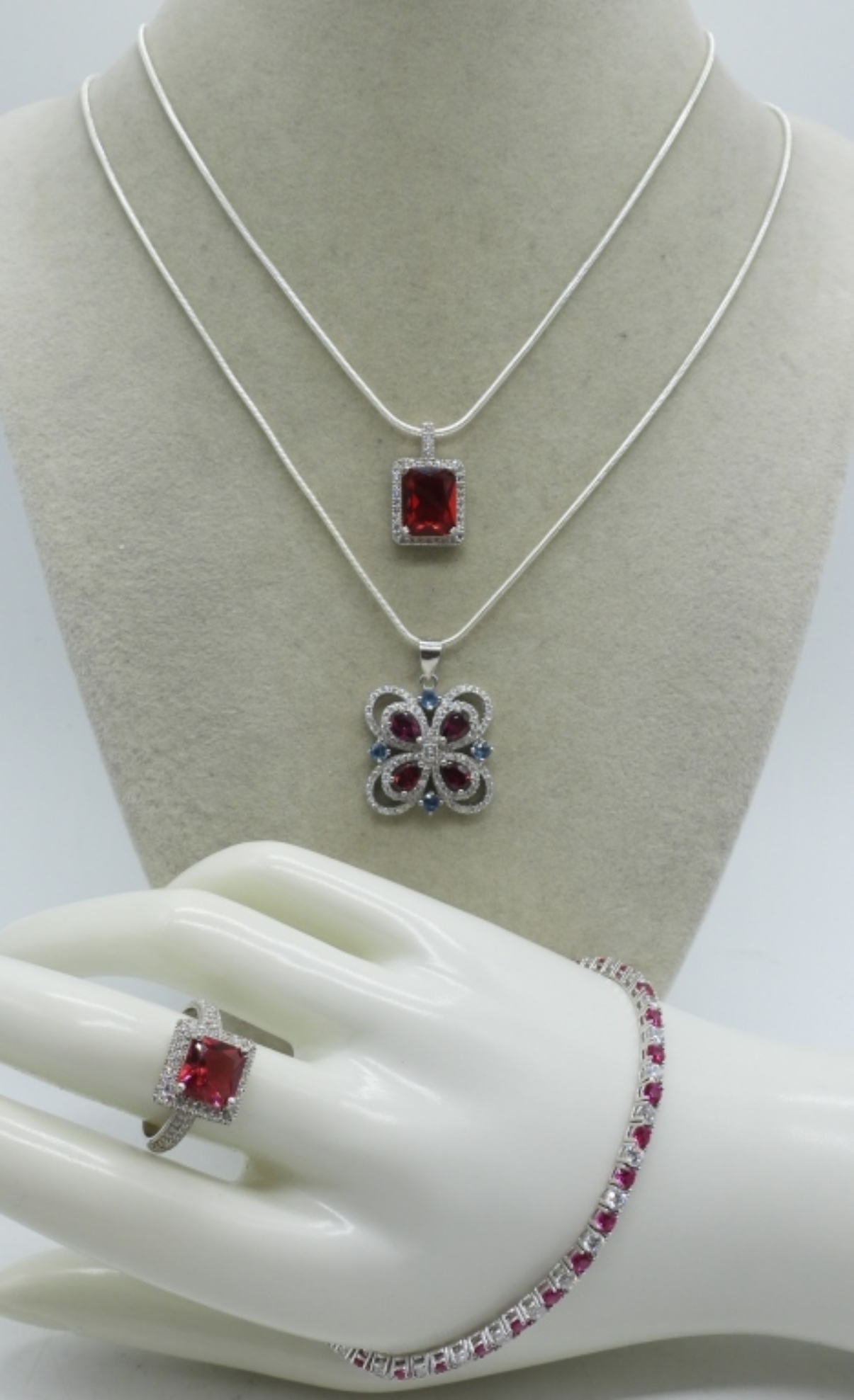 TWO BEAUTIFUL STERLING SIMULATED RUBY NECKLACE WITH SIMULATED DIAMONDS. 20″ STERLING CHAINS. SIMULATED RUBY & DIAMOND RING, SIZE 8. SIMULATED RUBY & DIAMOND BRACELET, 7.5″. (19.7 DWT)