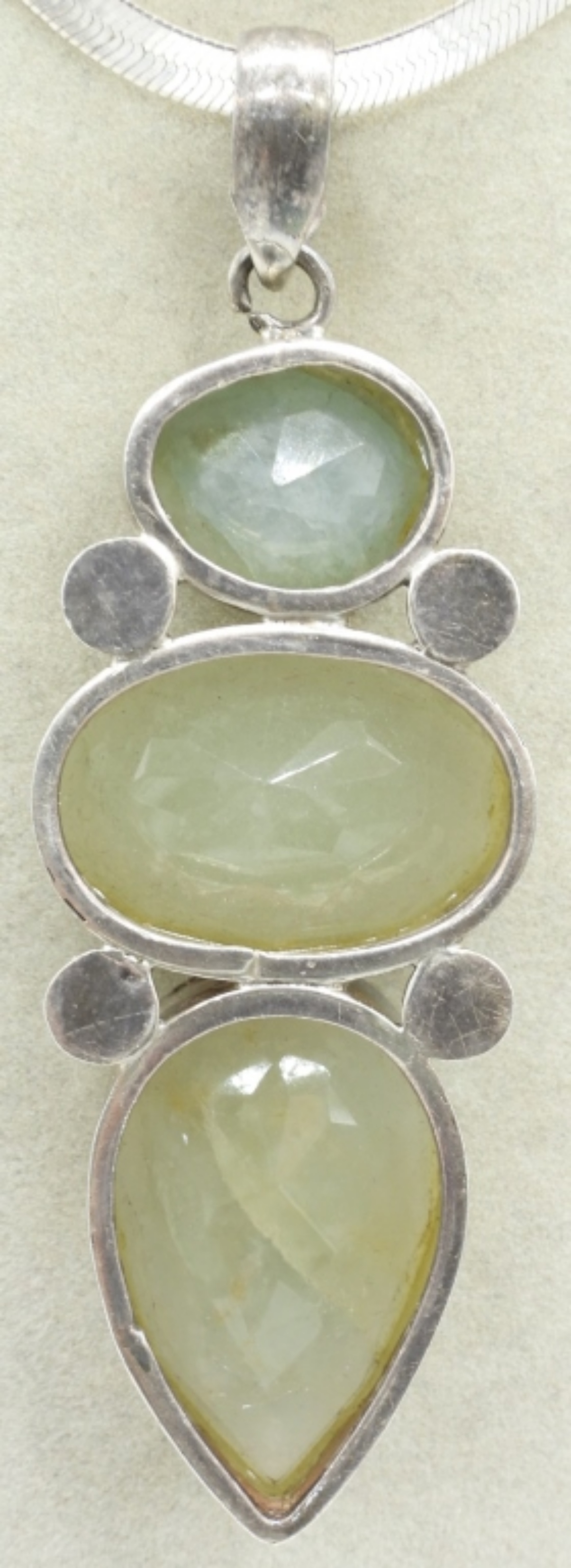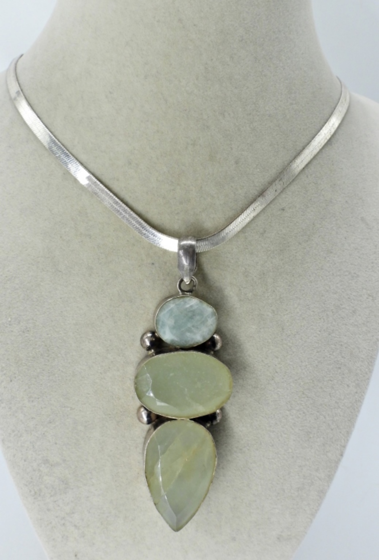 LARGE CHALCEDONY GEMSTONES SET IN STERLING, ON A STERLING HERRINGBONE CHAIN. PENDANT MEASURES 3.5″ LONG. CHAIN IS 20″. (23 DWT)