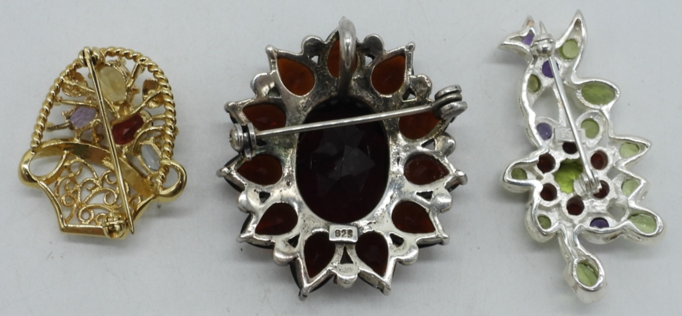 THREE STERLING PINS, GARNET, AMETHYST, PERIDOT, AQUAMARINE & CITRINE GEMSTONES. POSSIBLY SIMULATED GEMSTONES. (19 DWT)