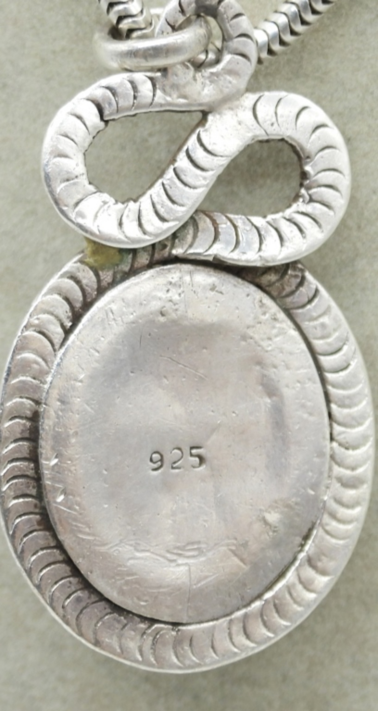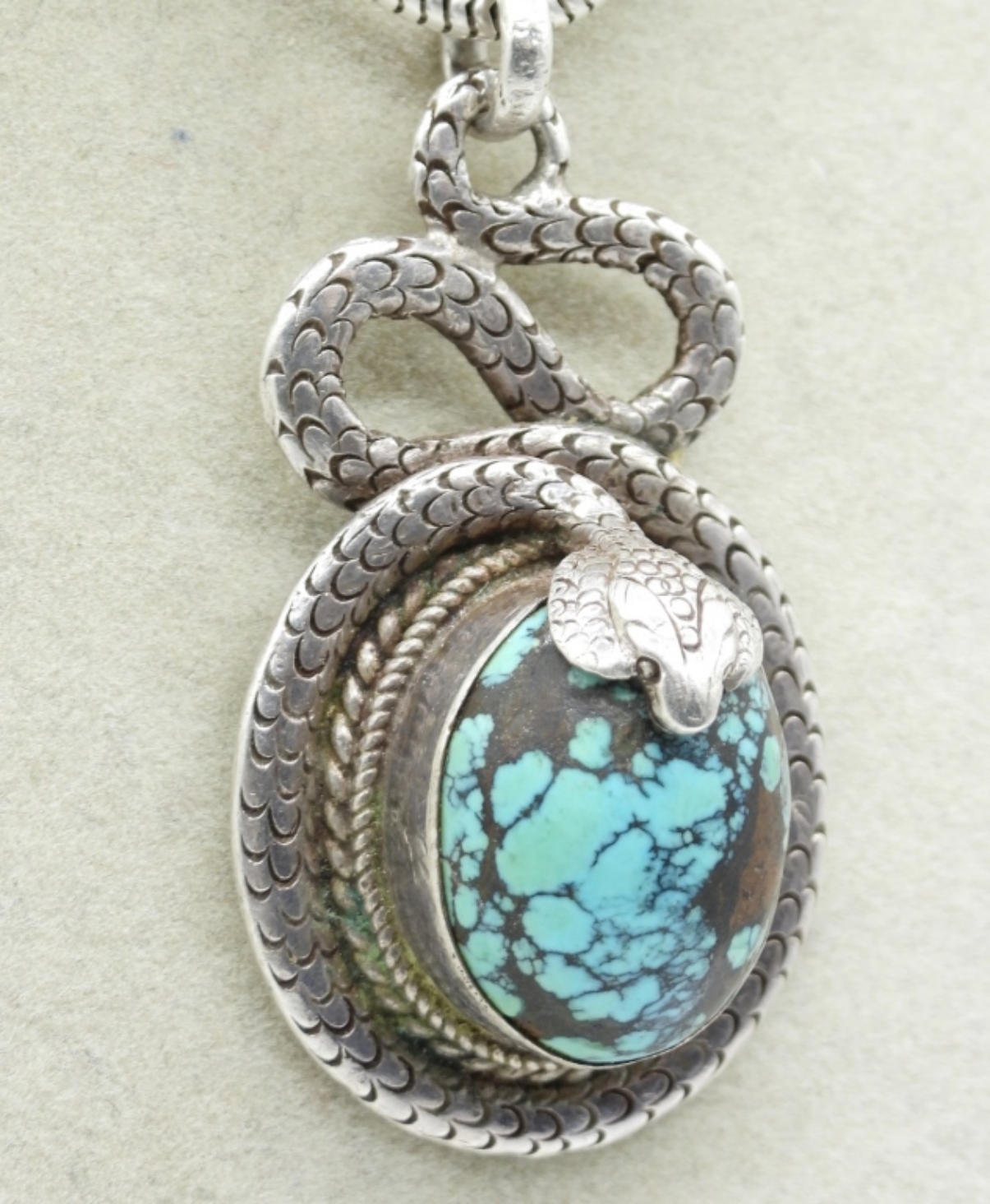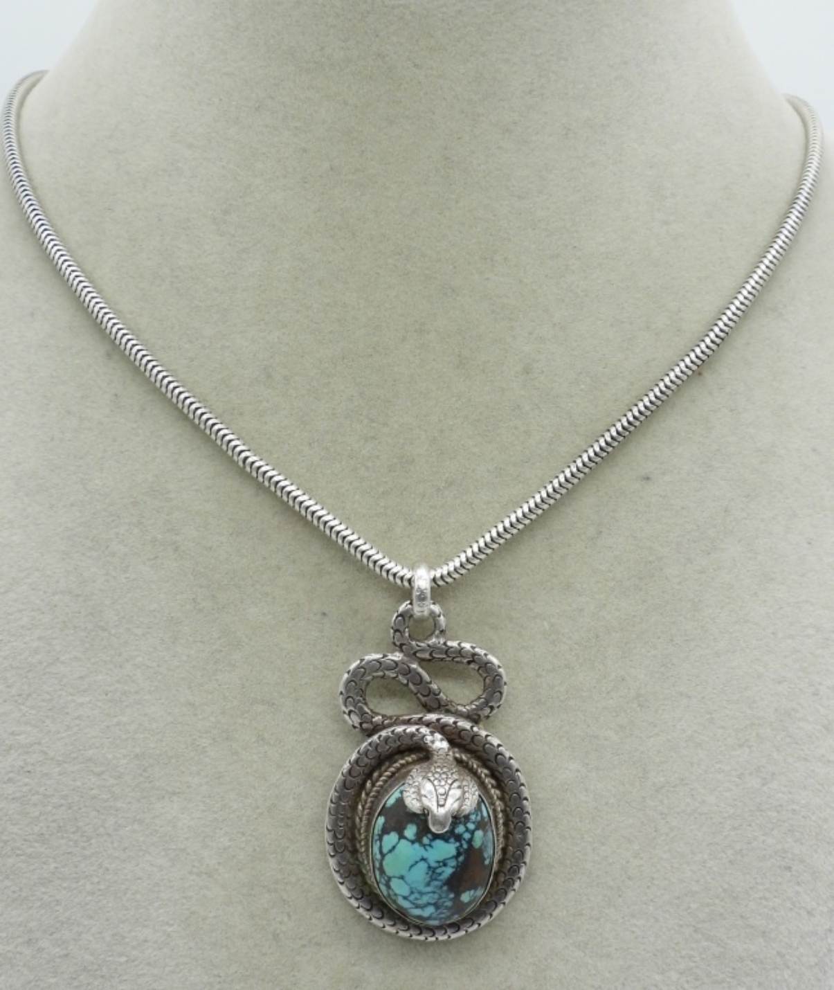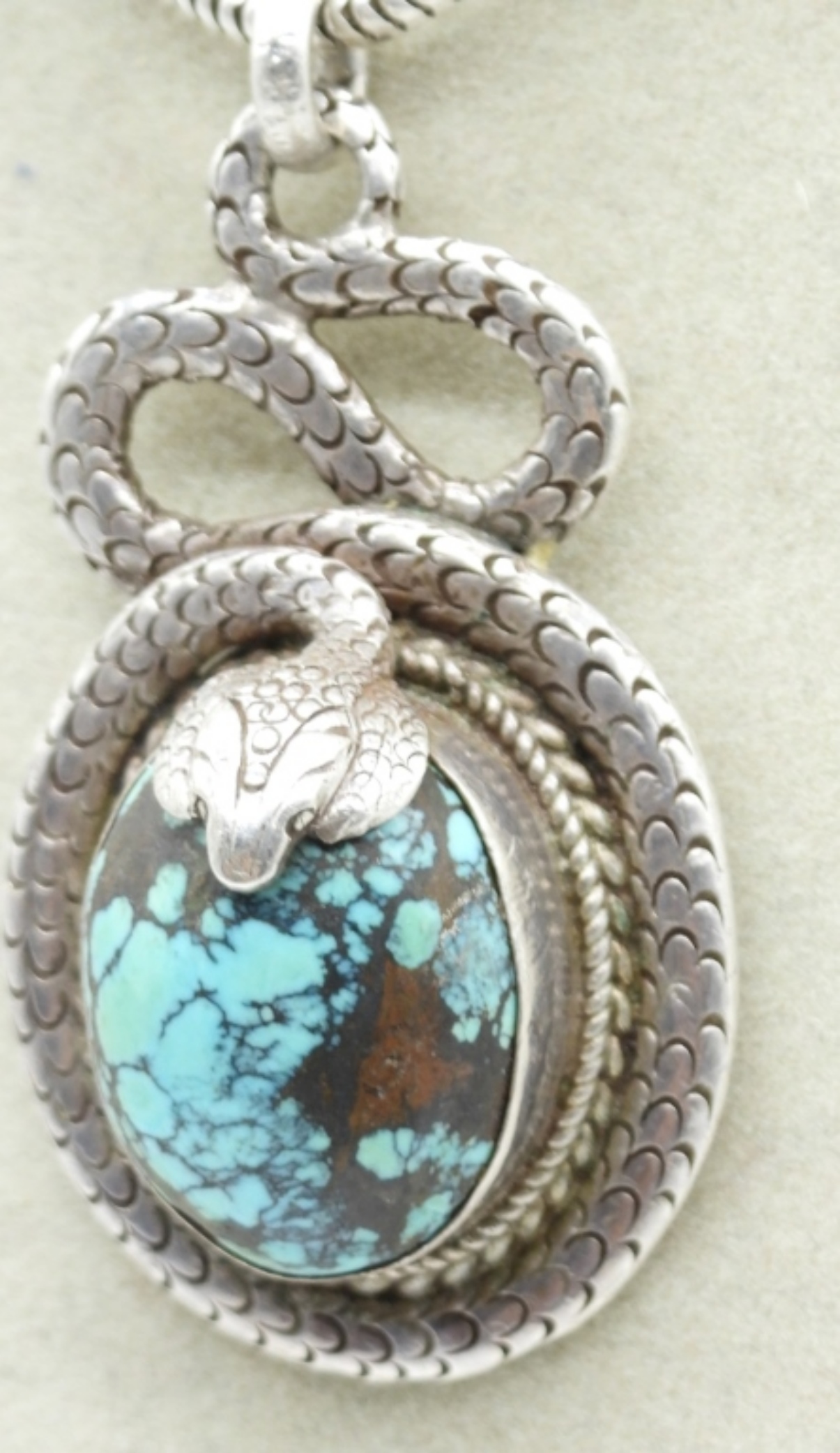 30″ STERLING CHAIN WITH A TURQUOISE SNAKE PENDANT. PENDANT MEASURES 2″. (22 DWT)