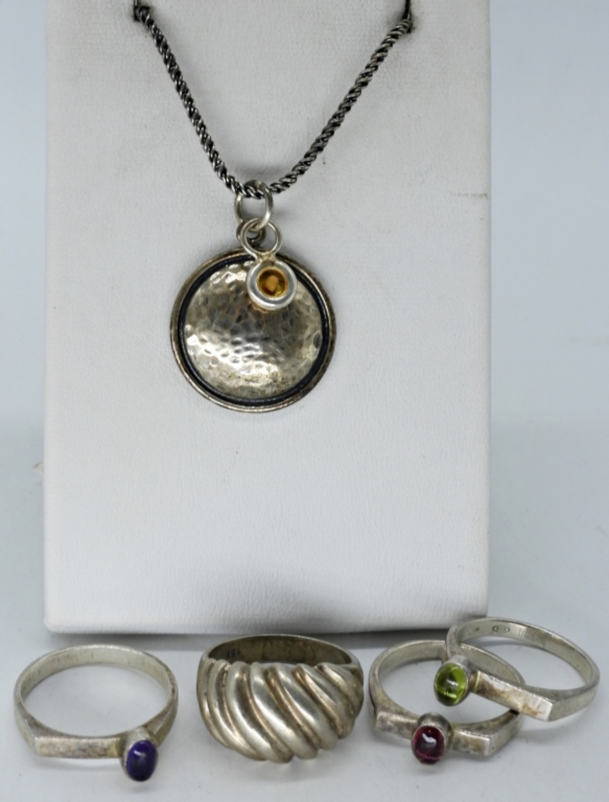 FOUR RINGS, SIZES 7 & 7.5 .. STERLING NECKLACE, 20″. (16.6 DWT)