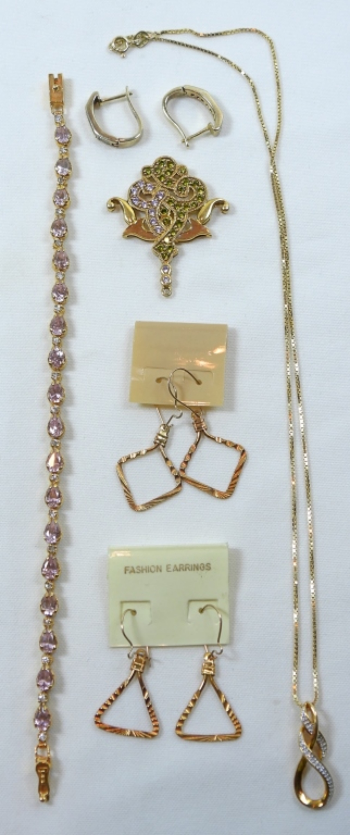 (3) PIERCED EARRING SETS, 16″ NECKLACE w/PENDANT, RHINESTONE PENDANT & 7 1/2″ BRACELET (18 DWT)
