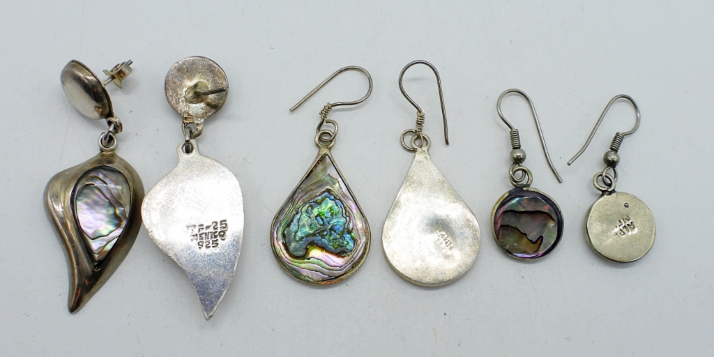 ONE PAIR OF STERLING ABALONE TAXCO PIERCED EARRINGS, 2″ LONG. MARKED “TF-25 MEXICO 925. ONE PAIR STERLING ABALONE ALPACA PIERCED EARRINGS, MARKED “ALPACA MEXICO”, 1.5″ LONG. STERLING TEARDROP SHAPED ABALONE EARRINGS,