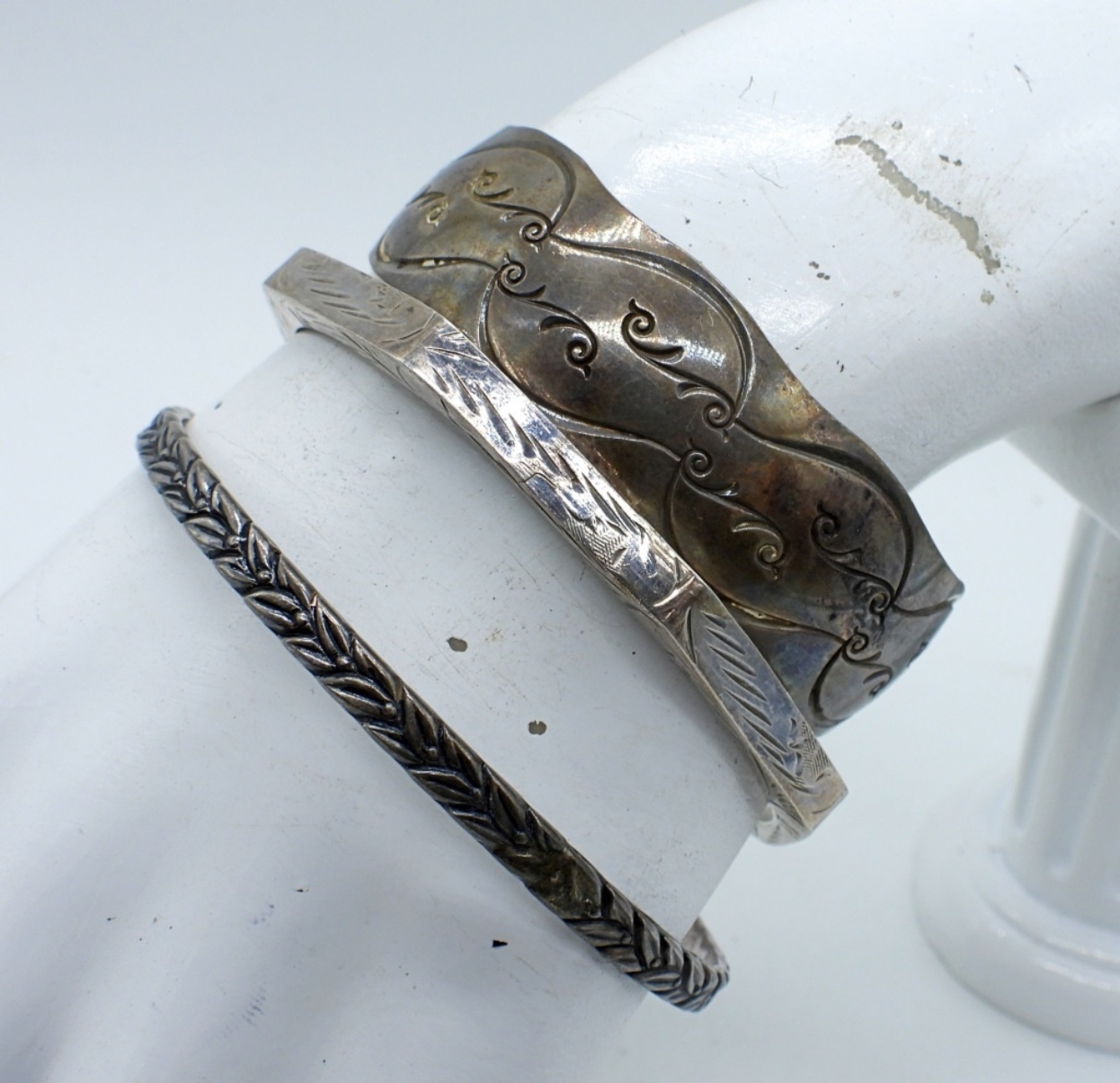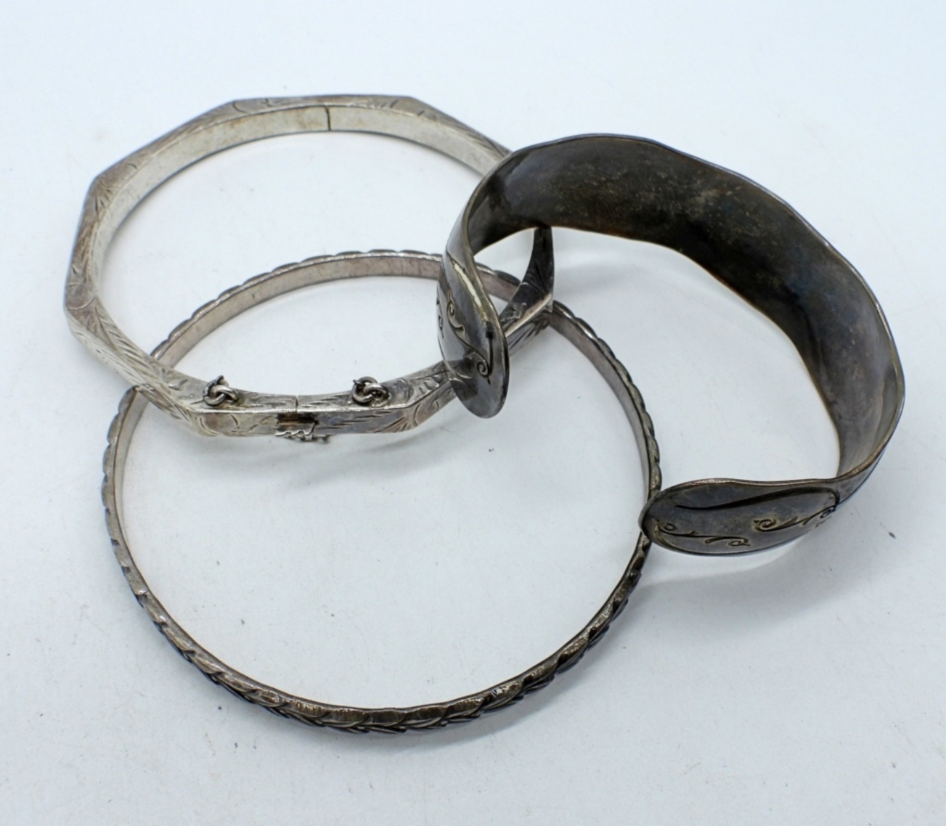 7-8″, CUFF, BANGLE & HINGED STERLING BRACELETS. (28 DWT)