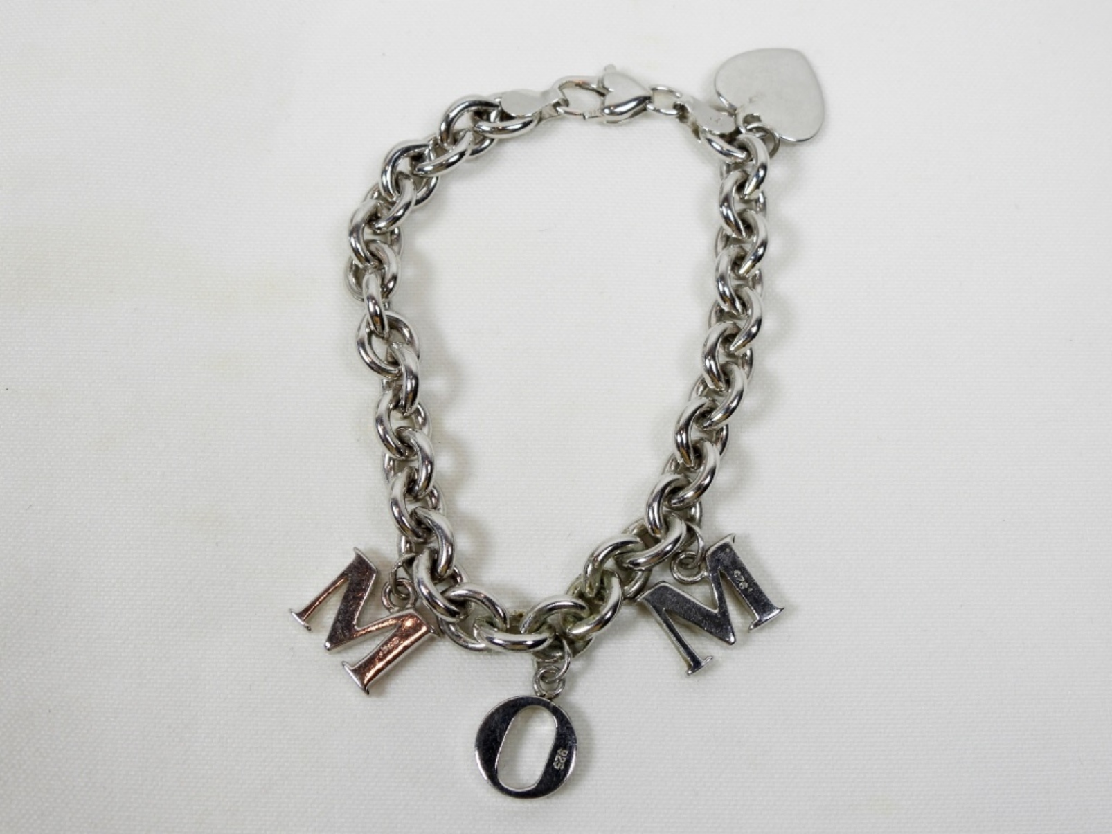 7” STERLING BRACELET. FOUR CHARMS, M O M & HEART (20.9 DWT)