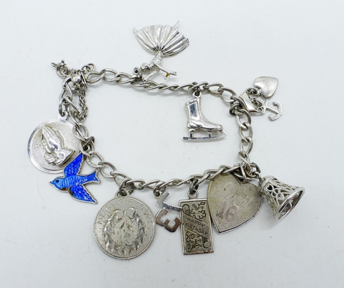 VINTAGE STERLING CHARM BRACELET, CIRCA 1973. 10 CHARMS. (18 DWT)