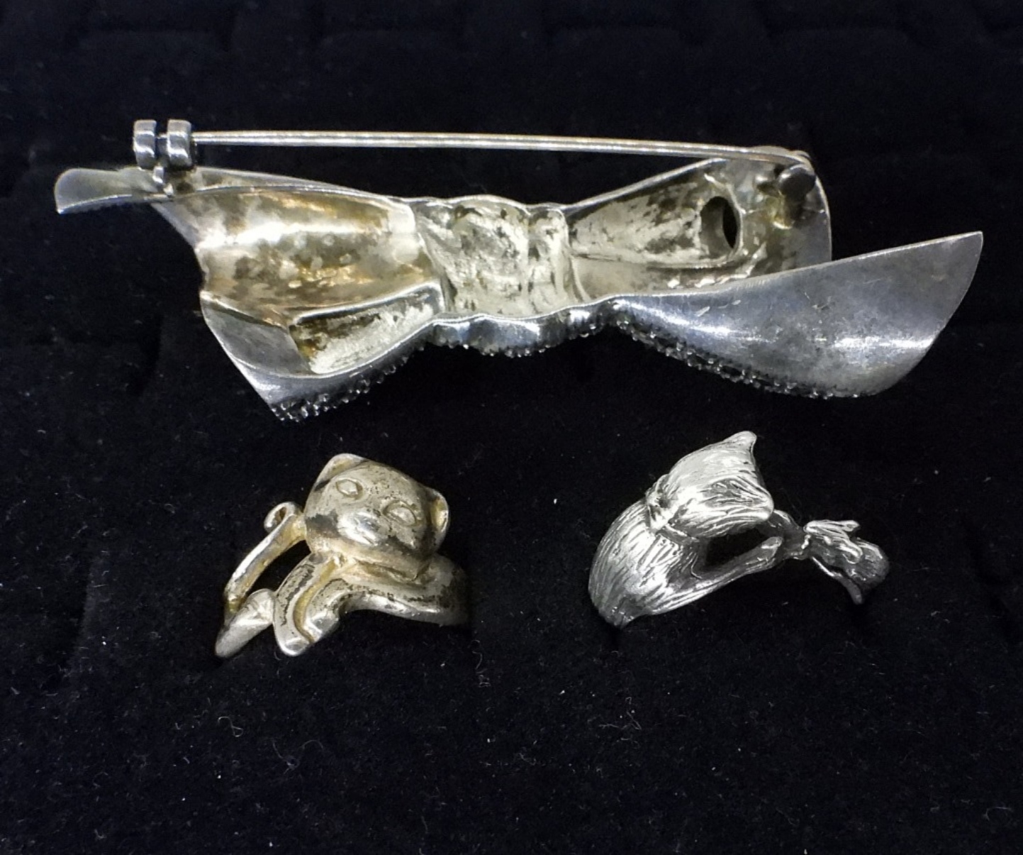 TWO STERLING CAT RINGS, SIZES 7-8. ONE LARGE MARCASITE STERLING BOW BROOCH. 3″ WIDE, 1.5″ LONG. (19.7 DWT)