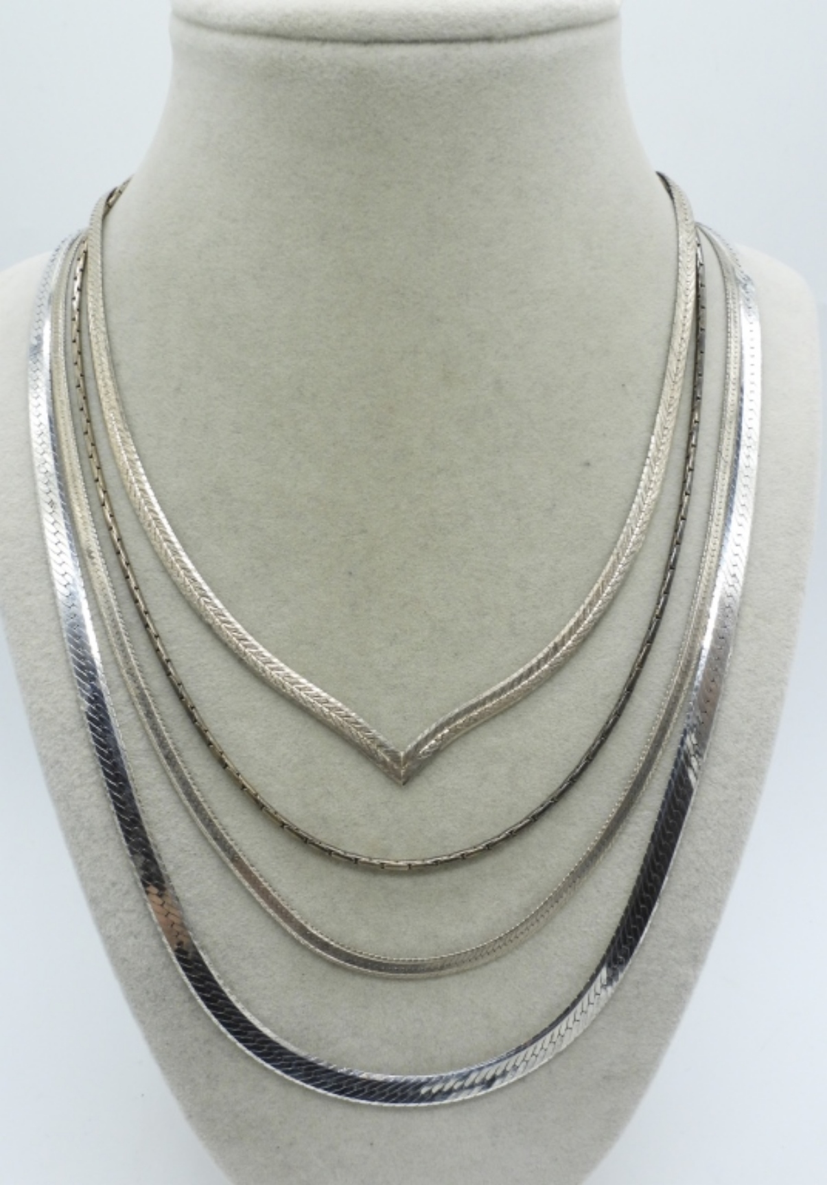 FOUR STERLING SILVER CHAINS, 18″, 24″, 30″. (35.3 DWT)
