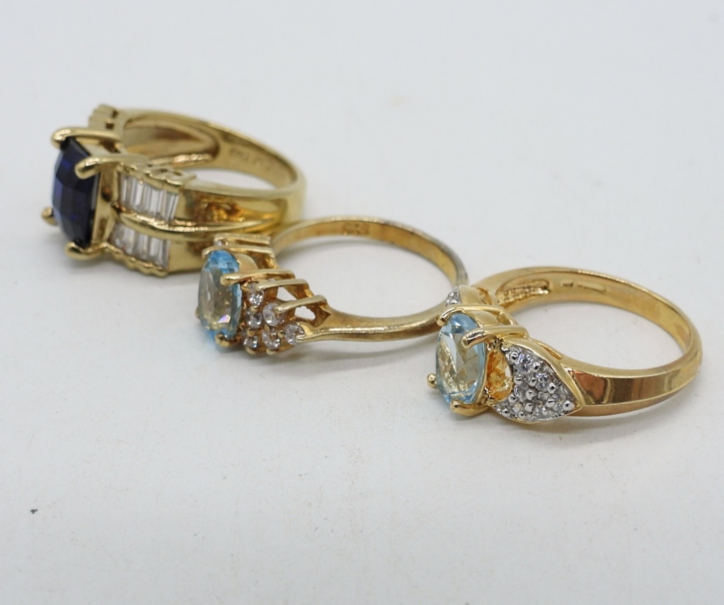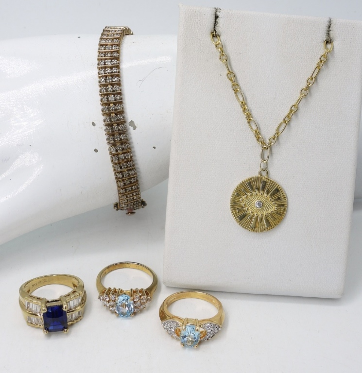 THREE STERLING GOLD TONE RINGS WITH SYNTHETIC BLUE GEMSTONES. 24″ EVIL EYE NECKLACE & GOLD TOE TENNIS BRACELET, 7″. RINGS ARE 5-6 (22.5 DWT)