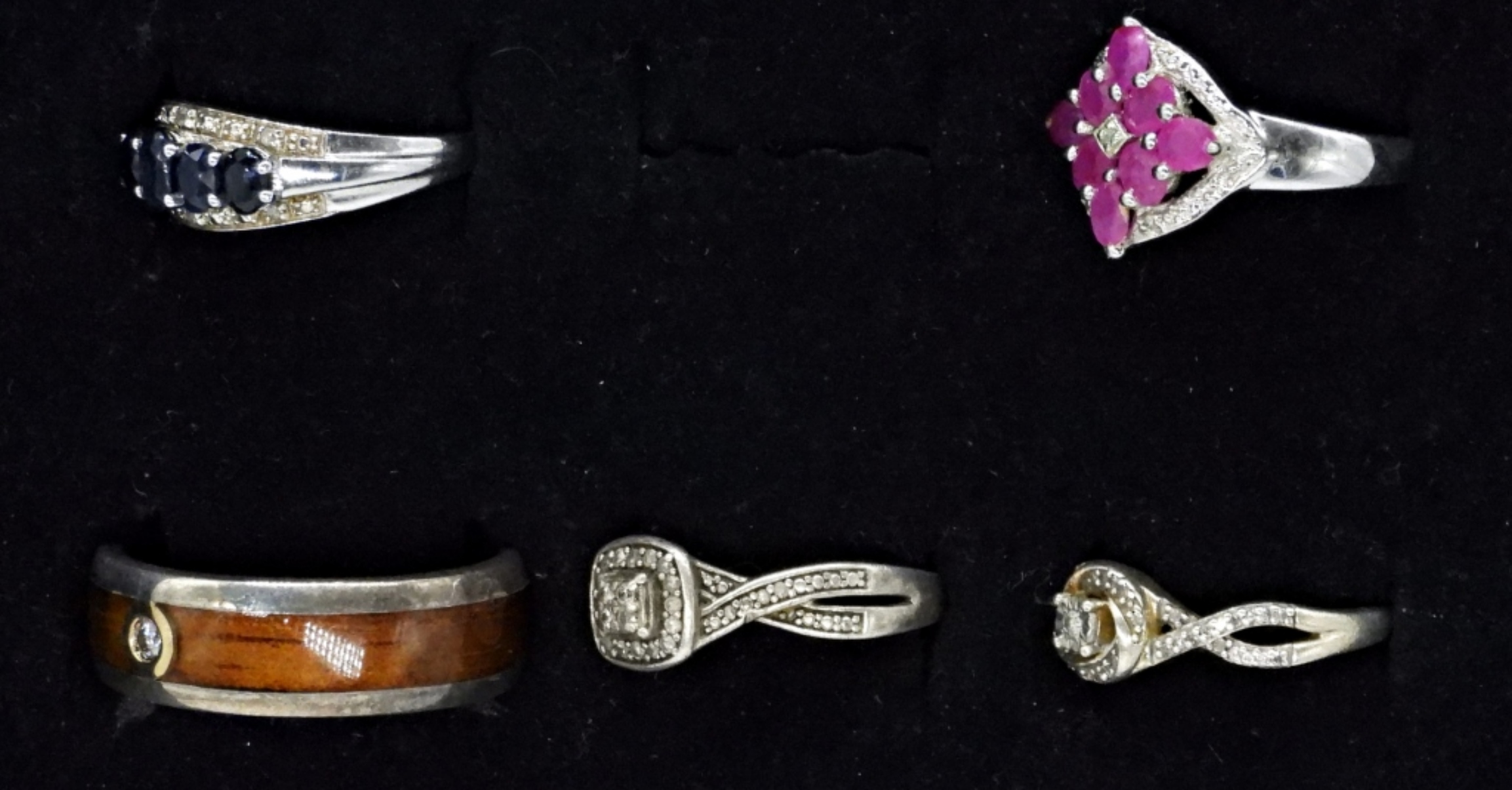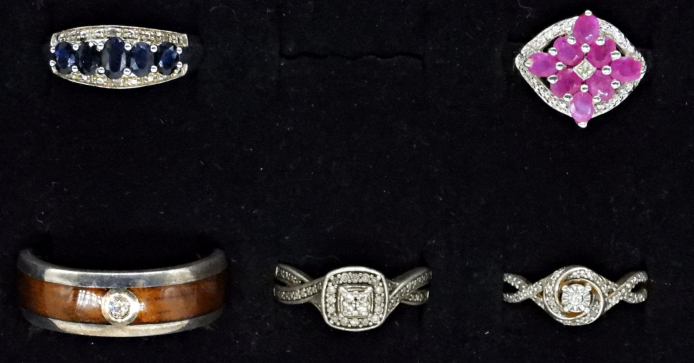 FIVE STERLING RINGS WITH GENUINE DIAMONDS, RUBIES AND SAPPHIRES. VERY NICE RINGS. SIZES 6, 7, 13. (14.2 DWT)