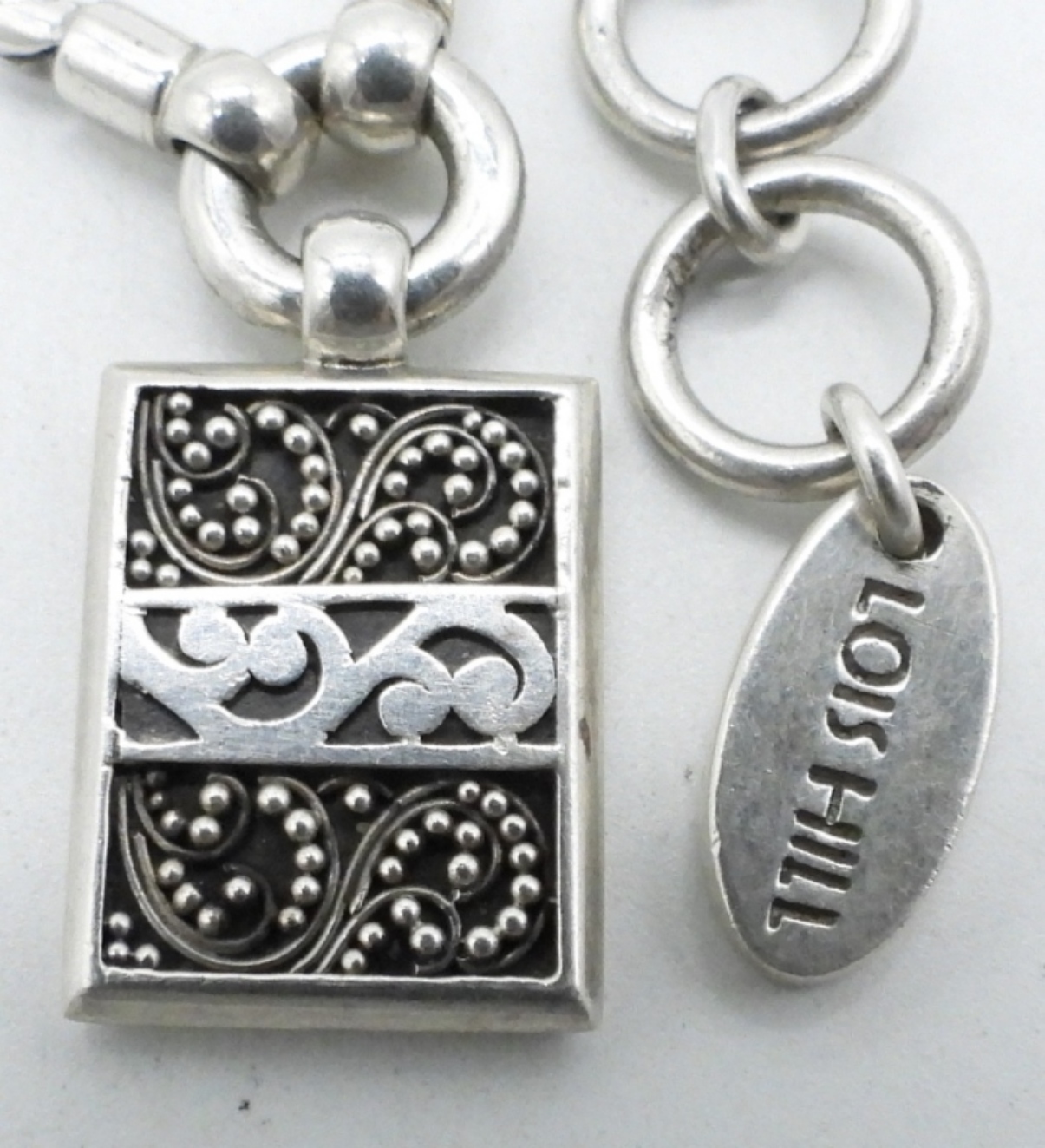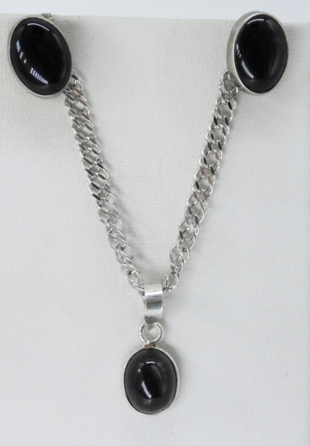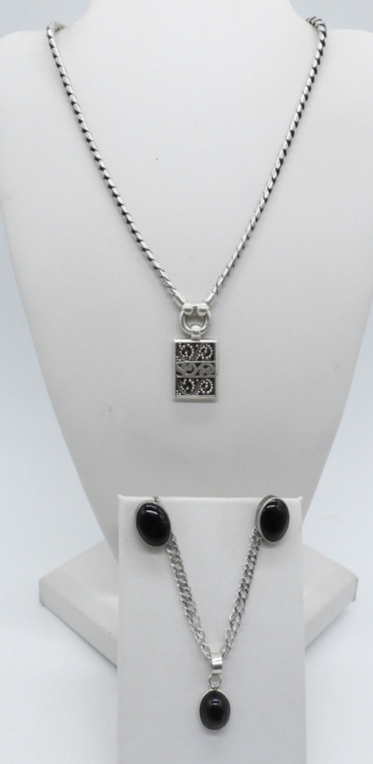 VINTAGE STERLING LOIS HILL NECKLACE WITH ADJUSTABLE TOGGLE CLASP, 7-10″. BLACK ONYX 925 PIERCED EARRINGS WITH NO BACKINGS. UNKNOWN BLACK GEMSTONE NECKLACE, 18″ STERLING CHAIN. (29 DWT)