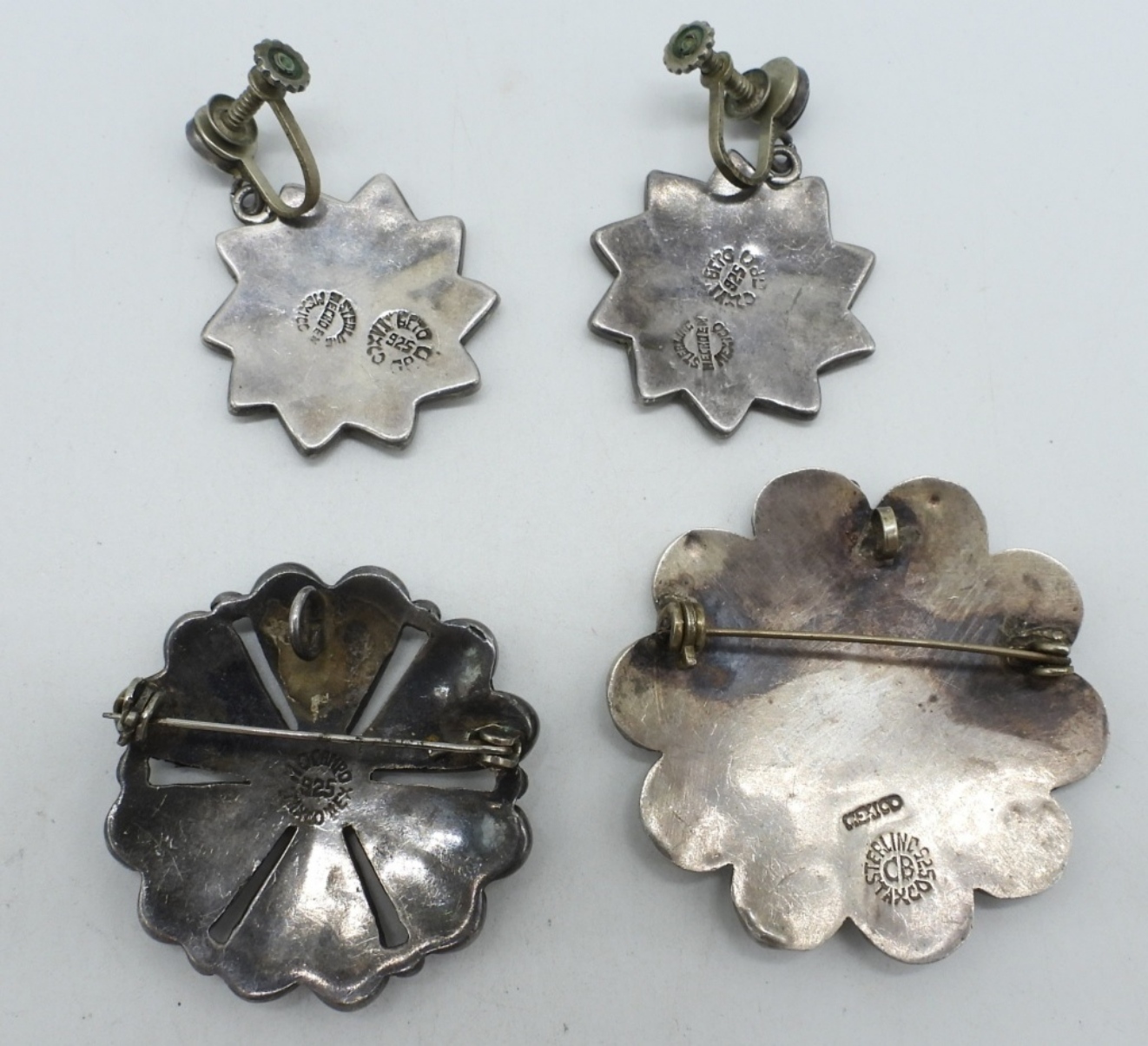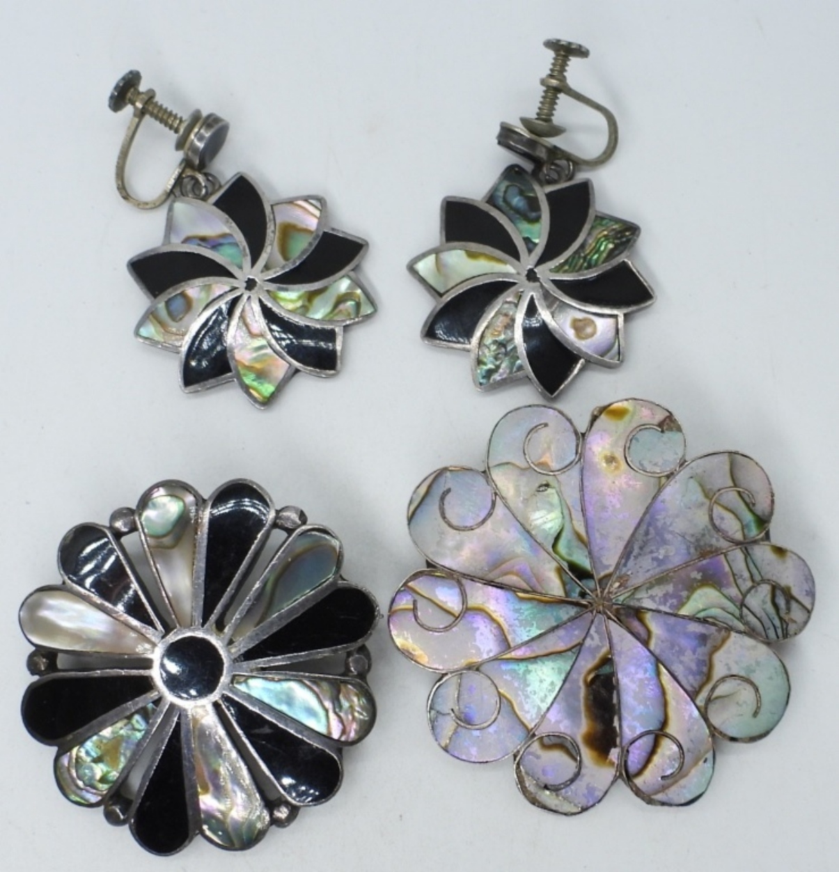 VINTAGE TAXCO MEXICO 925 PIN WITH MATCHING SCREW BACK EARRINGS. ONE MOTHER OF PEARL BROOCH, MEXICO TAXCO IN BAD CONDITION. THE MOTHER OF PEARL HAS LOST IT’S PROTECTIVE COVERING. ALL PIECES MARKED TAXCO! (17.2