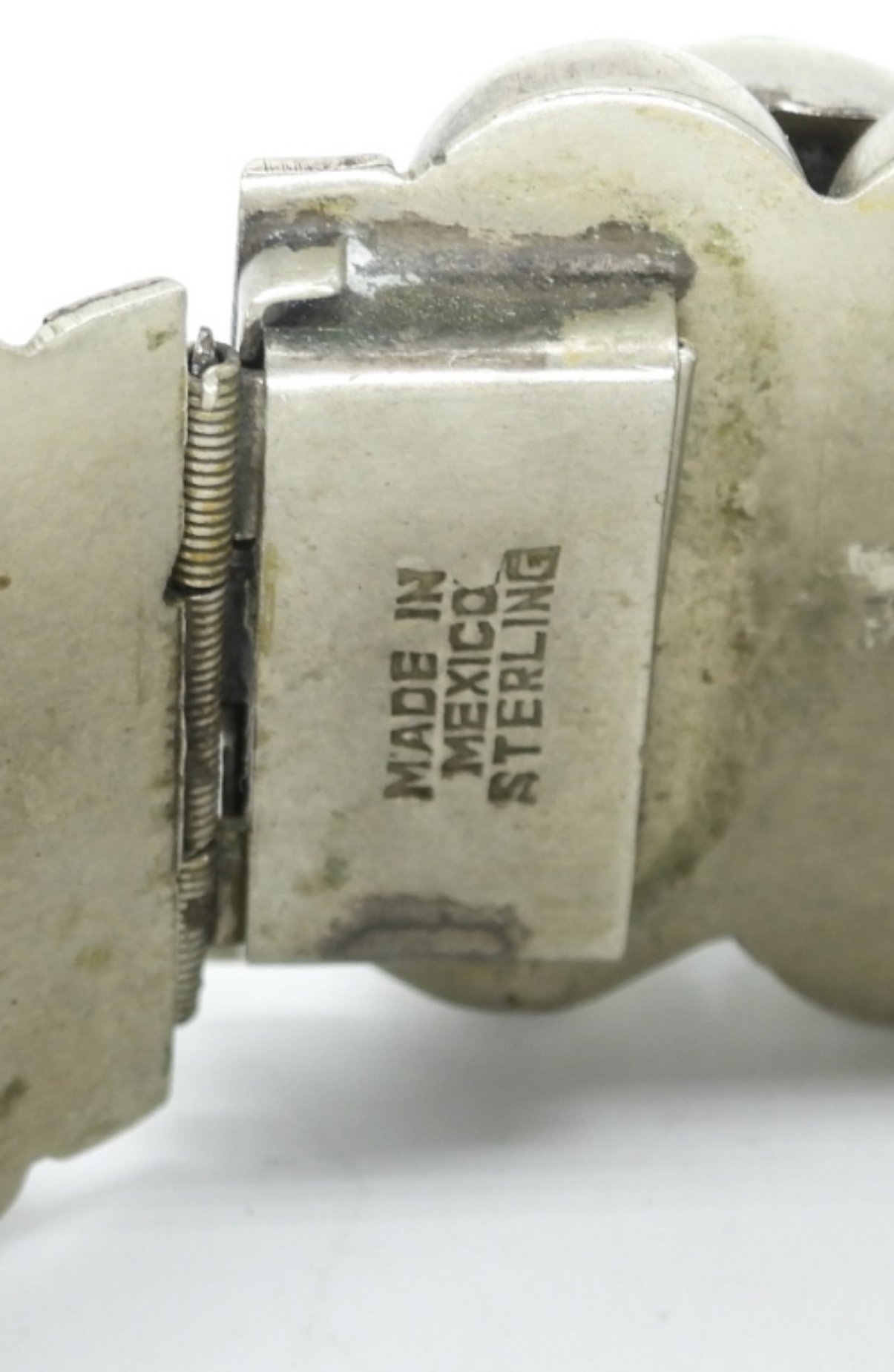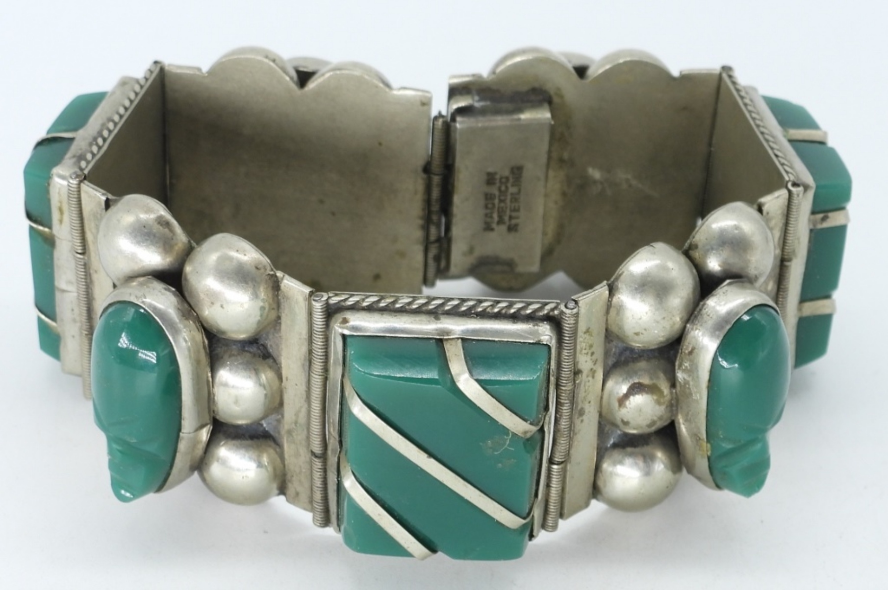 VINTAGE MEXICO STERLING, GREEN ONYX GEMSTONE BRACELET. 7.5″. VERY HEAVY PIECE (48 DWT)