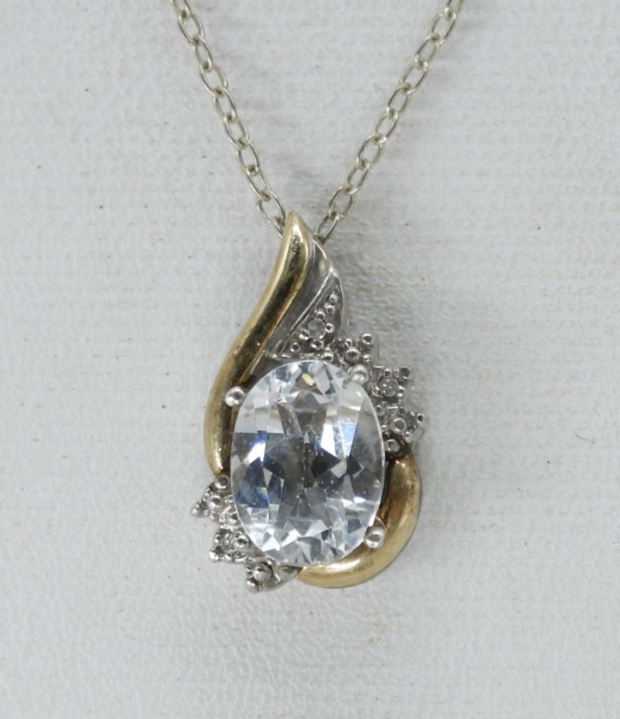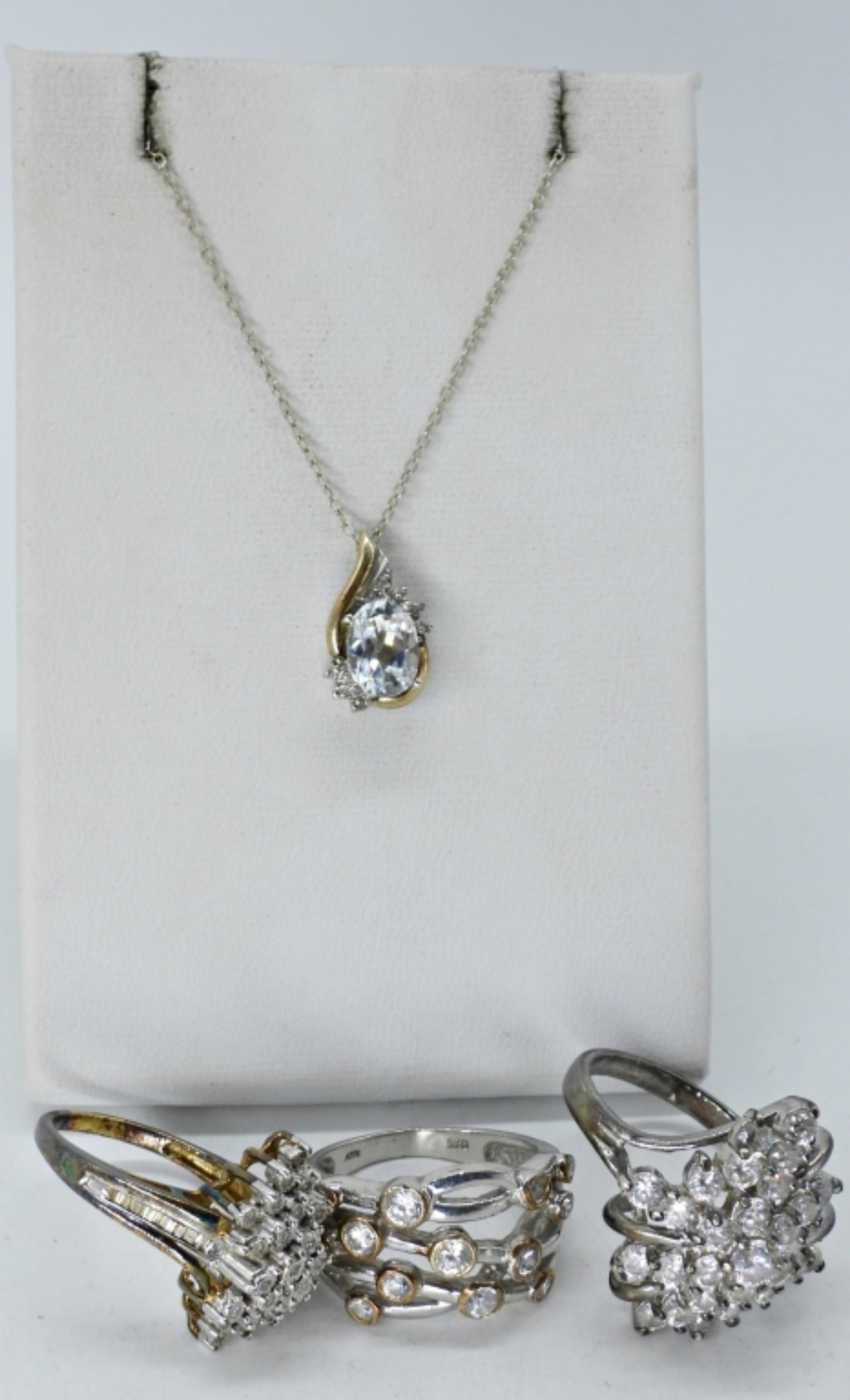 ONE BEAUTIFUL NECKLACE, STERLING WITH 10KG ACCENTS 16″ CHAIN. THREE STERLING, SIMULATED DIAMOND RINGS, SIZES 7 & 8. (11.5 DWT)