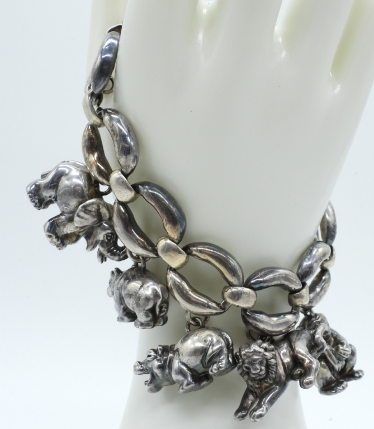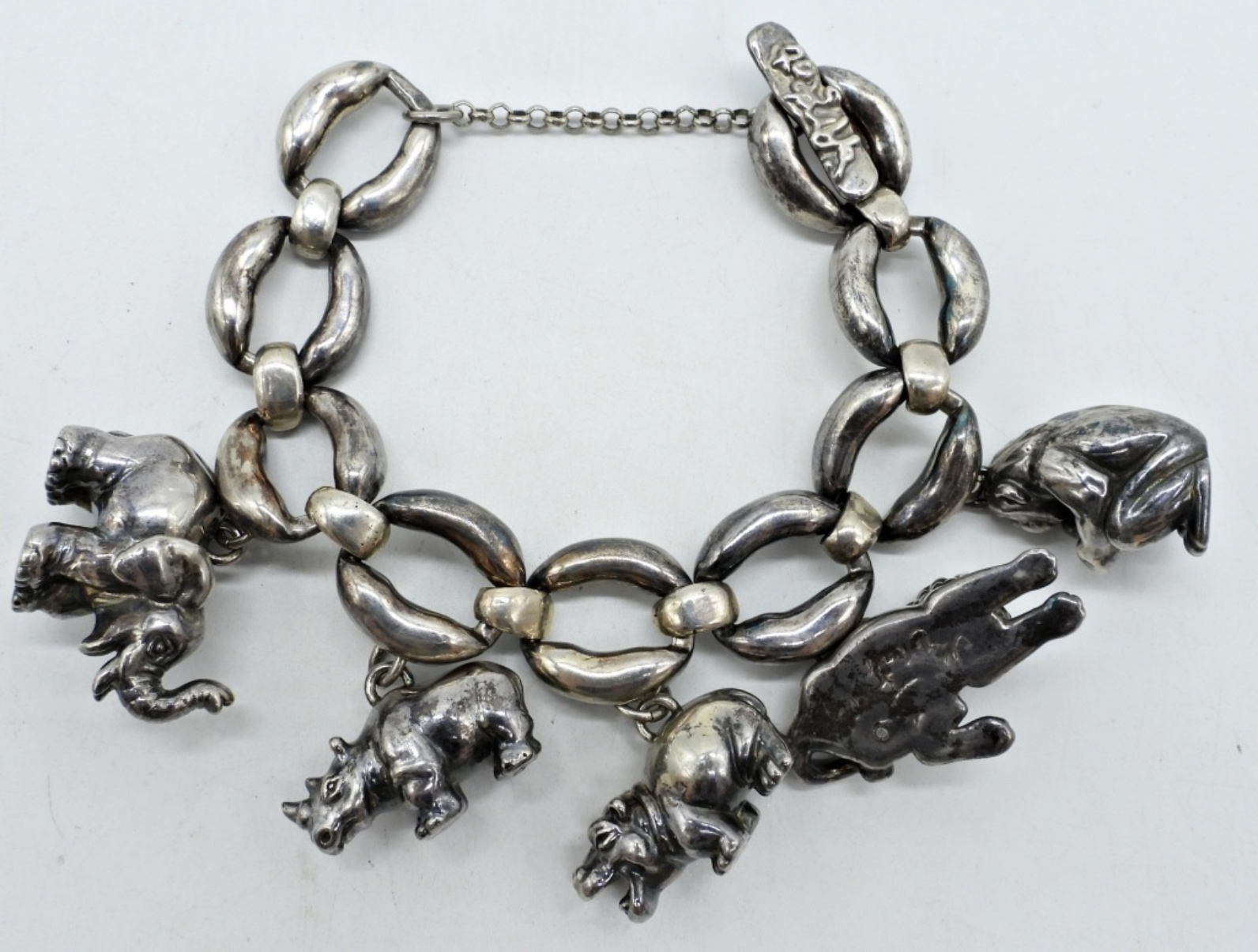CHUNKY, PUFFY STERLING ZOO ANIMAL CHARM BRACELET. IT’S ALL SLIGHTLY OVER SIZED. EACH ANIMAL IS MARKED 925. SEE DESIGNER MARKING IN PHOTO, CANT MAKE OUT WHAT IT SAYS. 9″ ADJUSTABLE. (32.7 DWT)