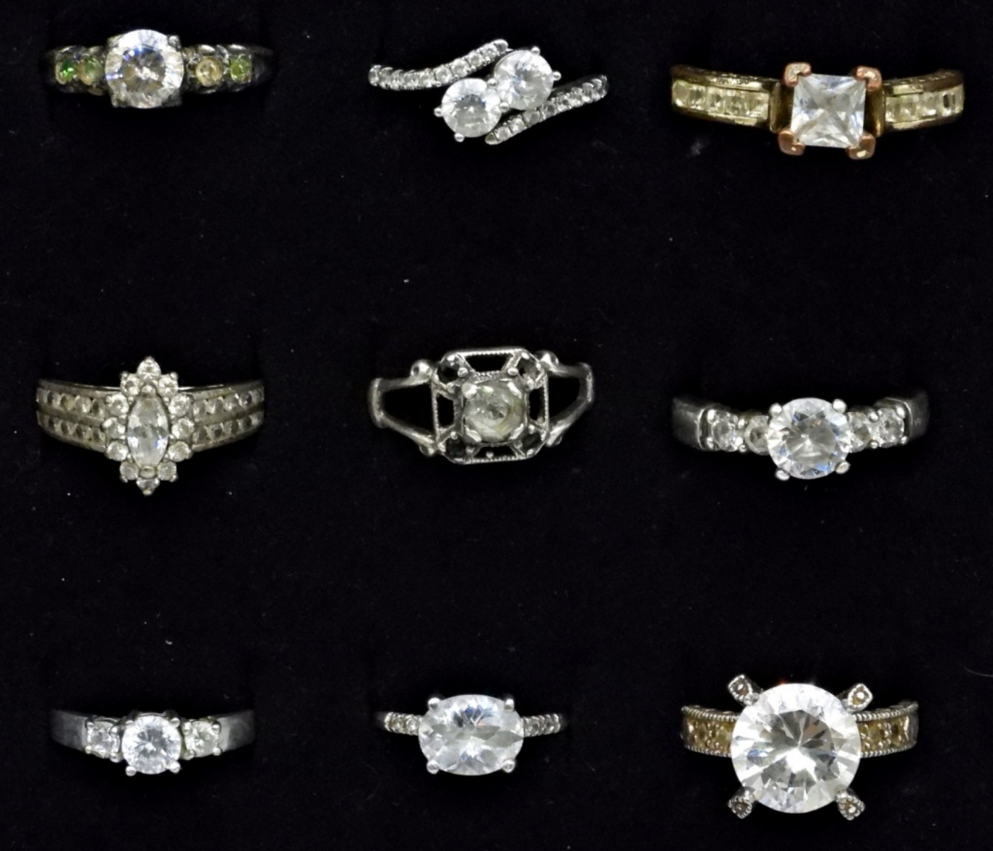 NINE STERLING SOLITAIRE STYLE RINGS. SIMULATED DIAMONDS. SIZES 6-12 SOME TARNISHING (20 DWT)