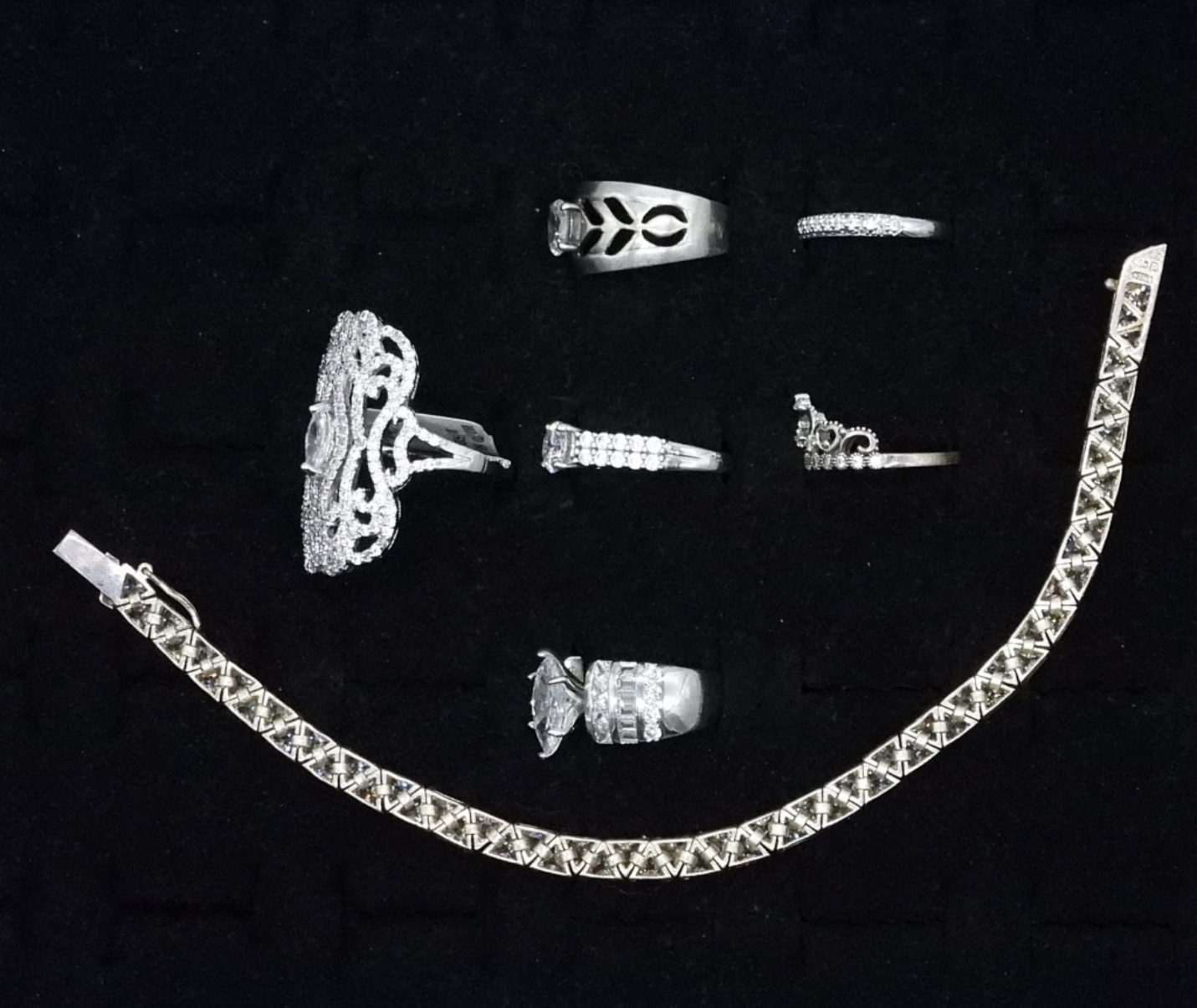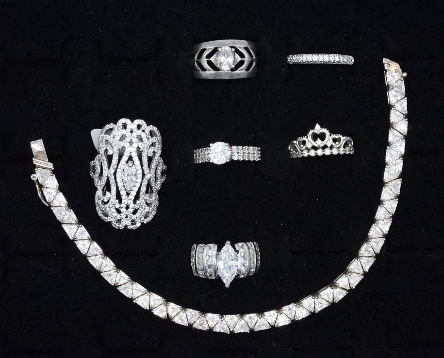 SIX STERLING RINGS WITH CLEAR GEMSTONES, SIZES 6, 7, 10. GORGEOUS STERLING 7″ BRACELET. (29 DWT)